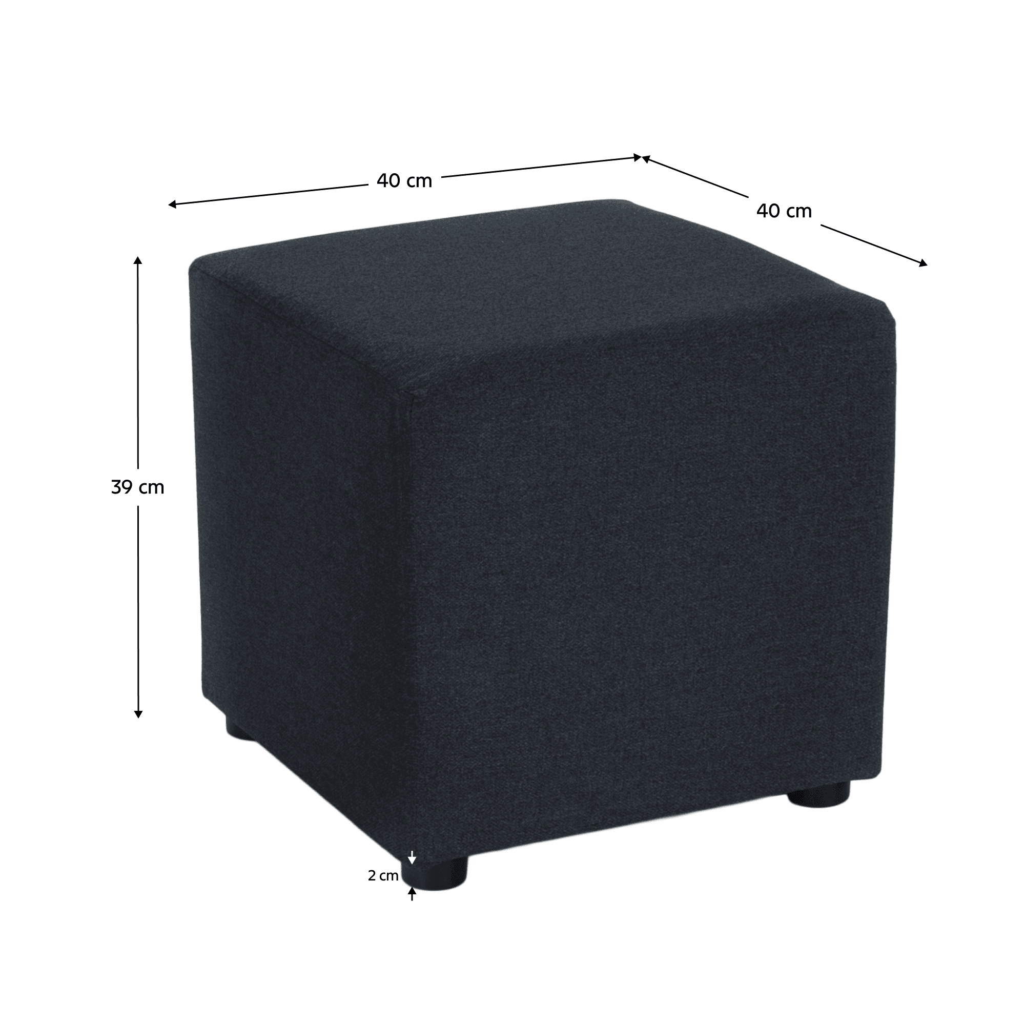 Material: ţesătură Twist 23 Variantă culoare: gri închis Rezistenţa la frecare a ţesăturii conform testului Martindale: 45.000 de cicluri de frecare Miez taburet: PAL/spumă pur Dimensiuni (Lxlxh): 40x40x39 cm Înălţimea părţii de şezut: 39 cm Adâncimea părţii de şezut: 40 cm Portanţă: 100 kg Cu ??picioare de plastic Înălţimea picioarelor: 2 cm Greutate: 2 kg Livrat asamblat