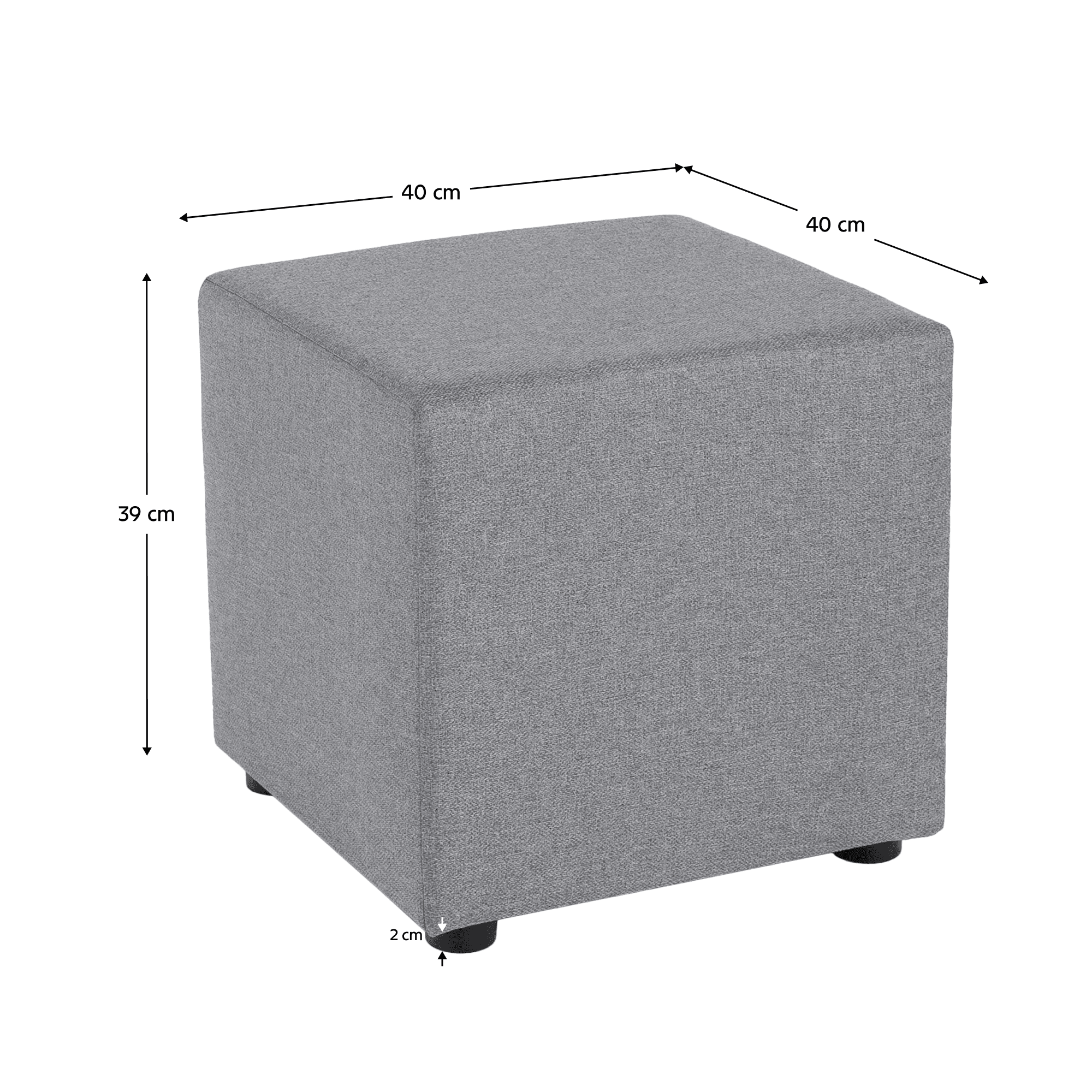 Material: ţesătură Twist 19 Versiune culoare: gri Rezistenţa la frecare a ţesăturii conform testului Martindale: 45.000 de cicluri de frecare Miez taburet: PAL/spumă pur Dimensiuni (Lxlxh): 40x40x39 cm Înălţimea părţii de şezut: 39 cm Adâncimea părţii de şezut: 40 cm Portanţă: 100 kg Cu ??picioare de plastic Înălţimea picioarelor: 2 cm Greutate: 2 kg Livrat asamblat