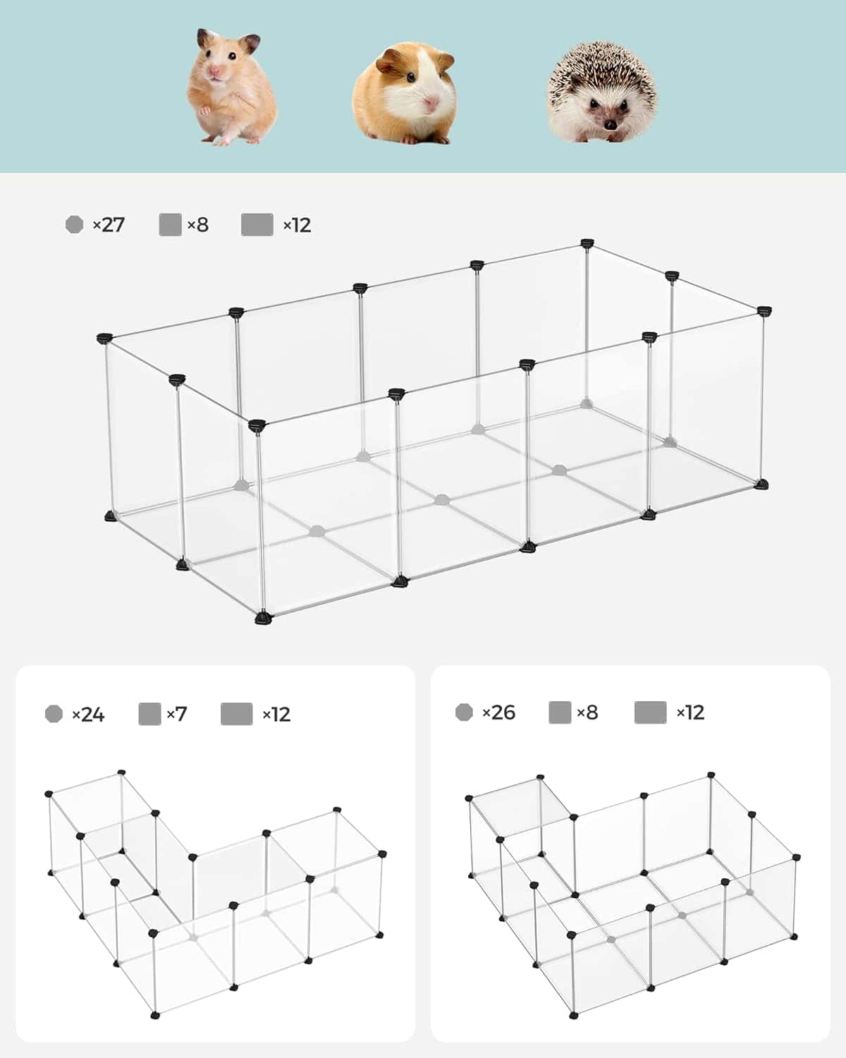 Culoare: Alb Marca: SONGMICS Material: Plastic Dimensiuni produs: 143L x 71W x 47H cm Despre acest articol Asamblarea este usoara: Pur si simplu imbinati panourile de plastic cu conectorii cu mai multe unghiuri cu ajutorul ciocanului de cauciuc inclus, veti instala rapid acest parc pentru animale de companie. Structura modulara, usoara, face, de asemenea, usor de demontat sau deplasat.Spatios si sigur: Aceasta tarc pentru animale de companie ofera o zona spatioasa pentru, hamsteri, arici sau iepurasi pentru a alerga, a explora si a se distra. Panourile netede de 45 x 35 cm si 35 x 35 cm le ofera putine sanse de a iesi.Detalii preventive: Podeaua acestei custi pentru hamsteri nu numai ca imbunatateste stabilitatea, dar ofera si protectie eficienta pentru podeaua dumneavoastra. Panourile si conectorii din plastic sunt ferm conectati pentru a preveni ca animalele mici sa iasa.Personalizabil si extensibil: In limita pieselor incluse, aceasta carcasa pentru animale de companie poate fi configurata in forma de L pentru colturi sau stivuita intr-o casa cu 2 etaje.Translucid si usor de curatat: Panourile din plastic translucid va permit sa urmariti si sa interactionati cu micutii dvs. prieteni. Cand tarcul se murdareste, stergeti-l cu o carpa umeda.