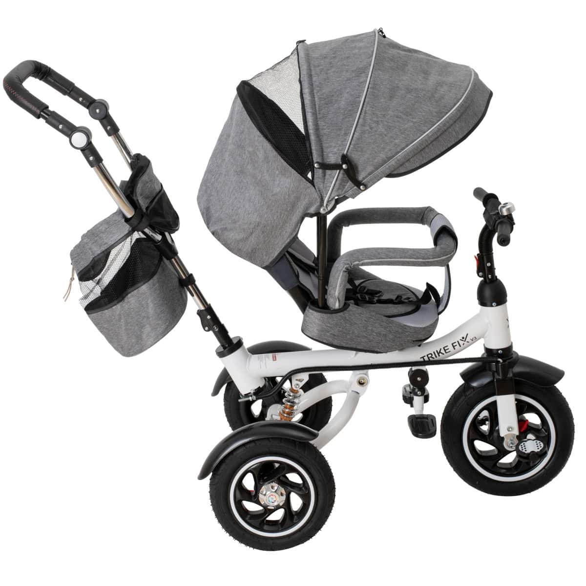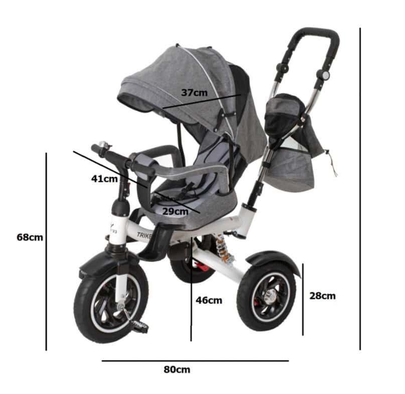 Tricicleta 3in1 105x52x94 cm, sezut rotativ 360°, roti fara aer, copertina reglabila, gri Mob360 – produs disponibil în magazinul Mob360.