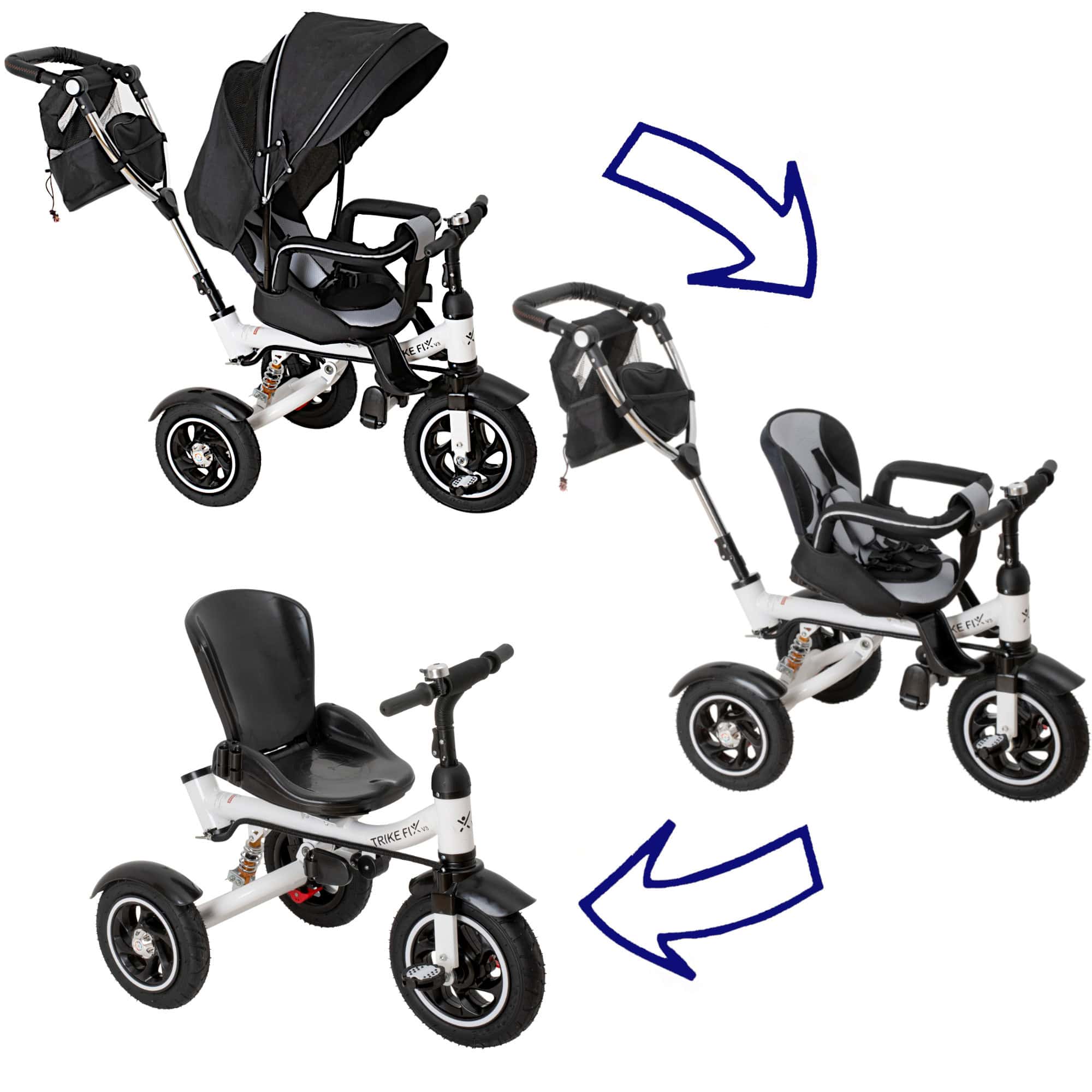 Tricicleta 3in1 105x52x94 cm, sezut rotativ 360°, roti fara aer, copertina reglabila, negru Mob360
