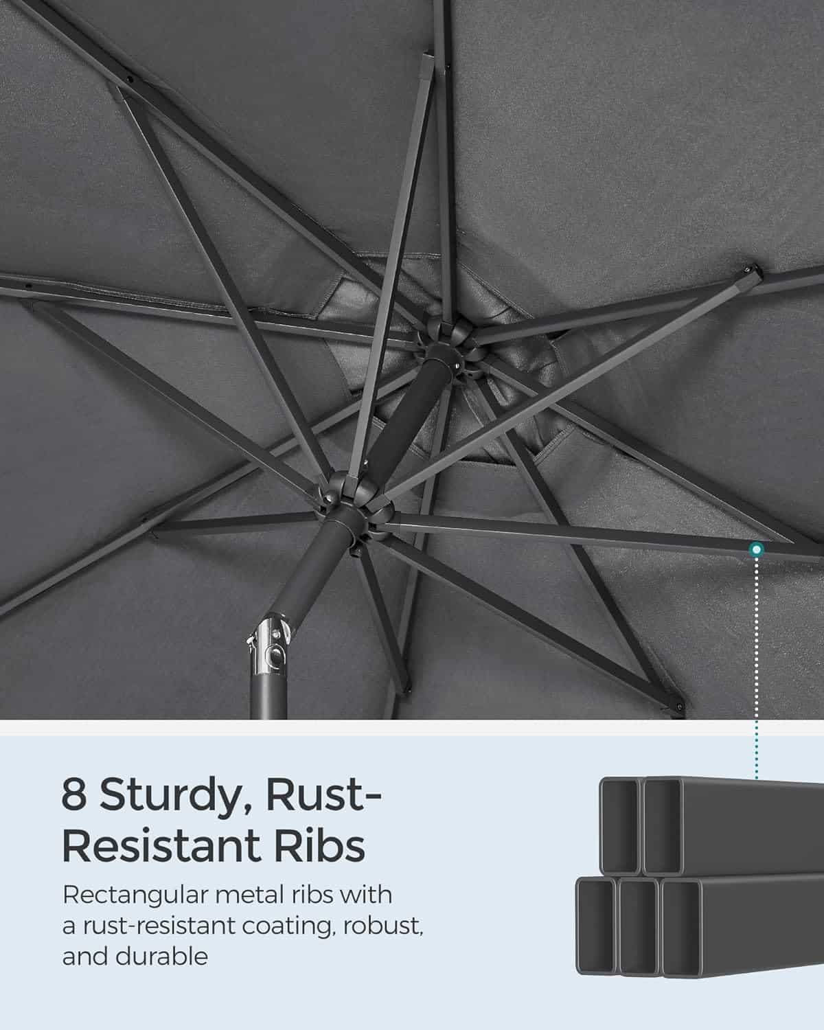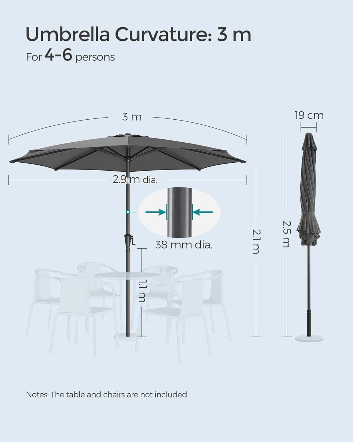 De asemenea, este hidrofug pentru a va proteja de ploaie.Coastele acestei umbrele de gradina sunt puternice si durabile, deoarece sunt fabricate din otel de calitate acoperit cu pulbere, rezistent la rugina, pentru o durata de viata lunga.Aceasta umbrela de gradina de 3 m poate face umbra la 4-6 persoane in gradina, pe terasa, la marginea piscinei, pe balcon sau in alta parte.