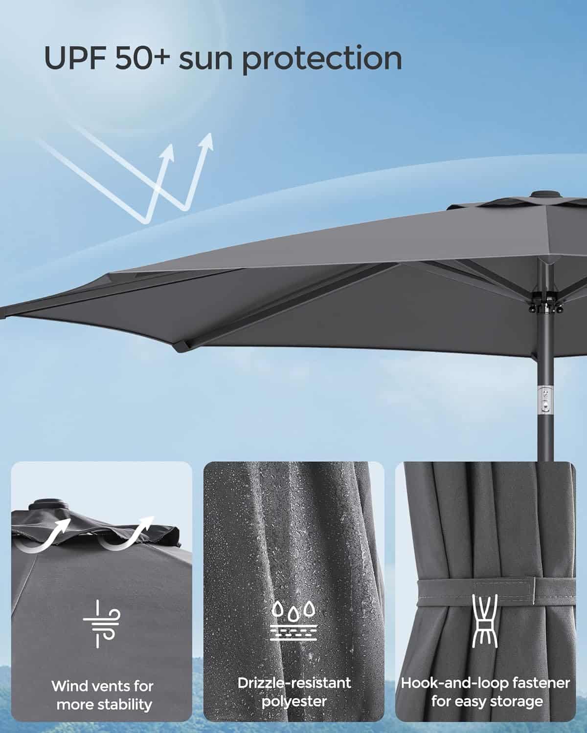 Rapid si usor!Acoperisul acestei umbrele de soare se poate inclina la 30° in 2 directii opuse – trebuie doar sa apasati butonul de pe articulatie pentru a o inclina.