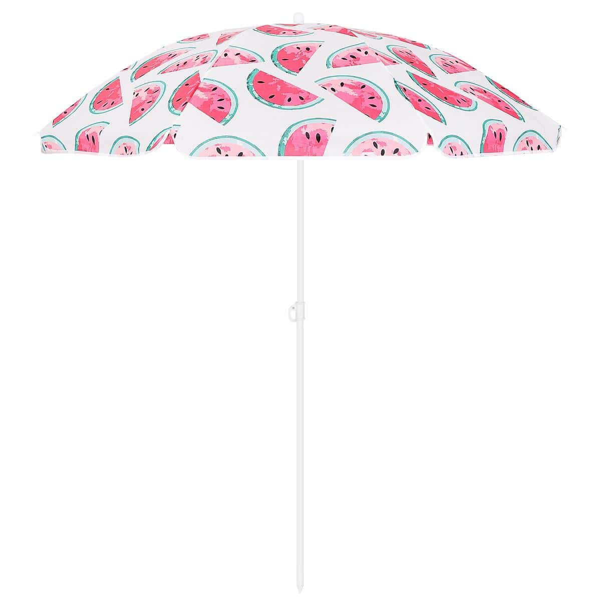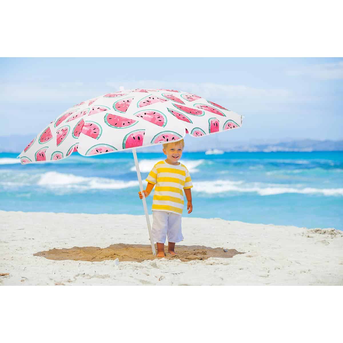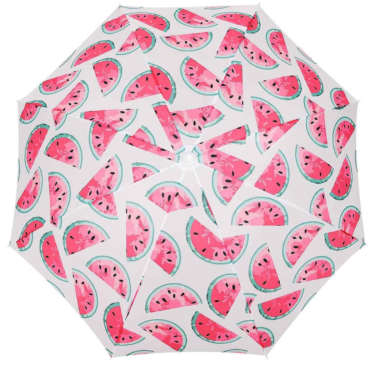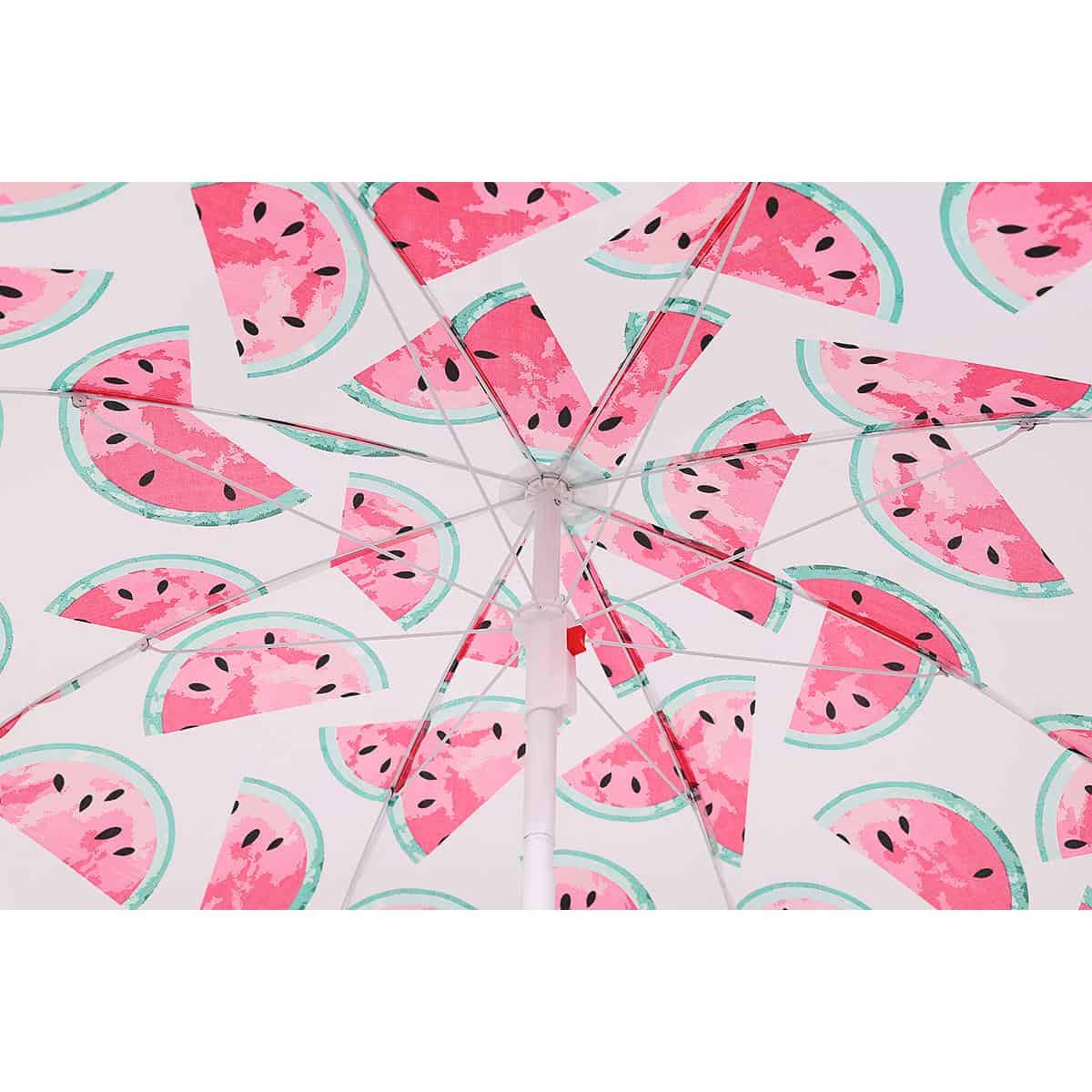 Specificatii tehnice Diametru exterior: 155-160 cm (masurat pe material) Diametru util interior: aproximativ 140 cm Reglare inaltime: Da, intre 115 si 170 cm Numar spite: 8 buc, lungime 76 cm Diametru spite: 2,5 mm Material cupola: Poliester 170T Material tija: Otel 19/22 mm Ventilatie superioara: Nu Protectie solara reflectorizanta: Nu Reglare unghi inclinare: Da Sistem fixare sol: Varf conic pentru nisip Culoare: Alb, rosu, verde Destinatie: Plaja, balcon, gradina, terasa Scurta descriere Umbrela de plaja si balcon cu design inspirat din pepene este perfecta pentru zilele toride petrecute la mare sau in gradina. Structura rezistenta din otel si cupola generoasa din poliester asigura umbra placuta si protectie eficienta. Se monteaza usor si permite reglaje flexibile atat pe inaltime, cat si in unghi, pentru o utilizare adaptata oricarui spatiu. Caracteristici principale Diametru generos de pana la 160 cm Design modern si vesel cu tematica pepene Reglaj pe inaltime si inclinare Structura din otel durabila 8 spite rezistente, lungi de 76 cm Usor de fixat in nisip gratie varfului conic Material poliester rezistent 170T Ideal pentru balcon, terasa, plaja sau gradina