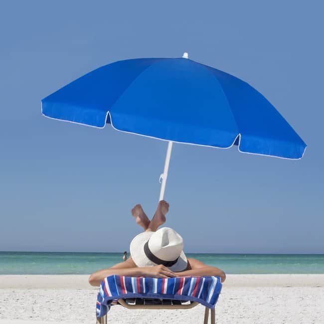 O umbrela cu picior va oferi umbra relaxanta tuturor in zilele fierbinti de vara. Forma geometrica si baldachinul albastru al umbrelei ii confera un caracter inovator si elegant. Metoda inovatoare de desfasurare a bratelor asigura ca materialul este tinut corect pe baldachinul umbrelei. Datorita reglajului pe inaltime, puteti regla liber umbrela dupa preferintele dvs. Umbrela de plaja poate fi usor desfasurata si pliata. Facand clic pe butonul rosu, pozitia acestuia va fi blocata pe blocajul care mentine cadrul intr-o pozitie fixa. Va oferi o umbra placuta, datorita careia va puteti bucura de vara fara grija. Copiii se pot juca sub ea, pe plaja sau la apa, la adapost de soarele cel mai puternic. Cel mai mare avantaj al umbrelei este cu siguranta posibilitatea de a o infige direct in pamant sau nisip, ceea ce iti va permite sa o iei cu tine la apa sau in vacanta. Dimensiunea redusa dupa pliere ii permite sa fie transportata rapid in masina. Proprietatile produsului: Reglarea pe inaltime este intre 138-225 cmLatimea baldachinului umbrelei este de 240 cmIntinderea ajunge pana la 210 cmLungimea umbrelei atunci cand este pliata este de 125 cmDiametrul tubului masoara 28 mmUmbrela este reglabila in inaltimeCuloarea cadrului este albaCuloarea albastra a acoperisului umbrelei