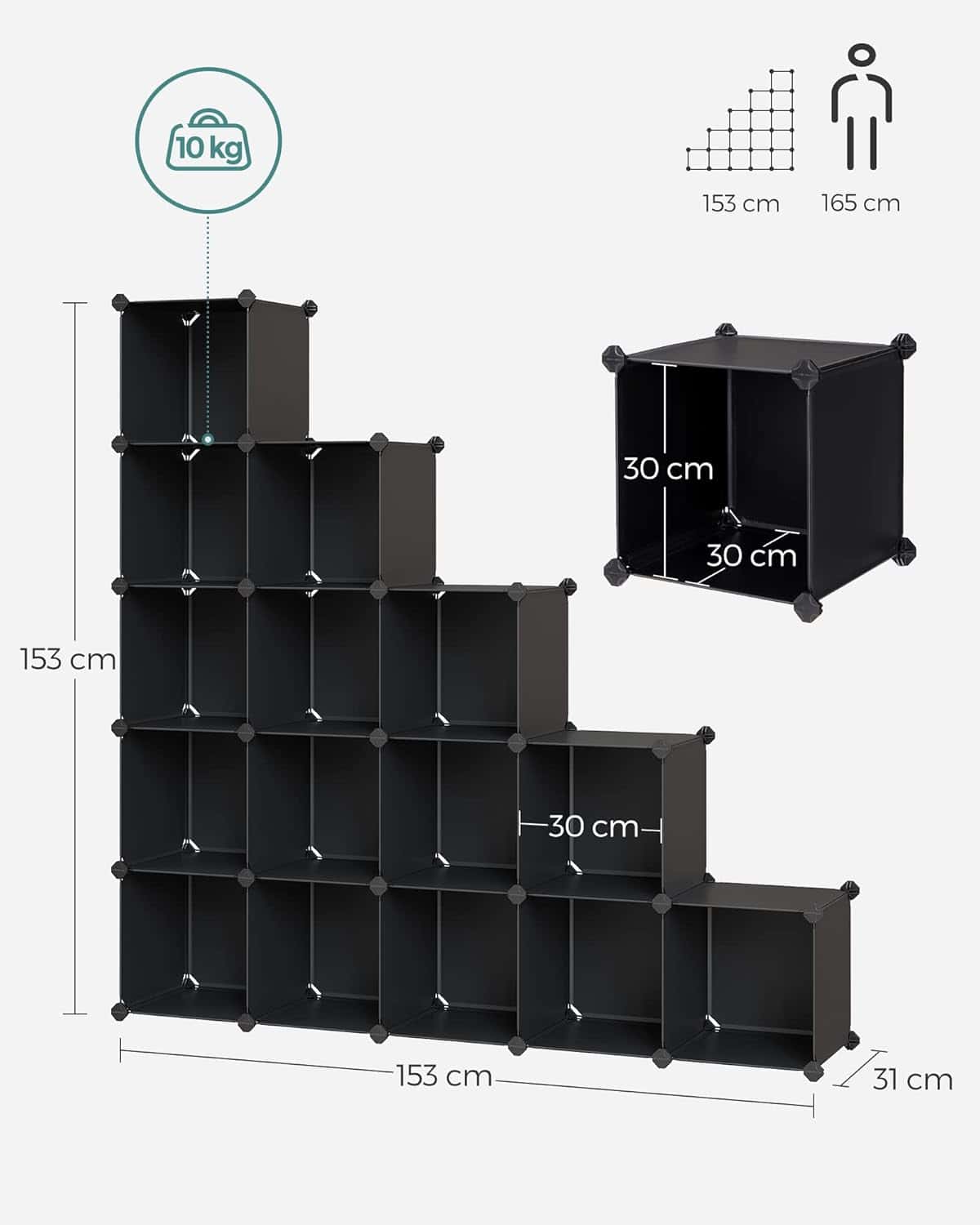 Specificatii: Culoare: Negru Material: Panou din plastic PP, cadru din fier, conector din plastic ABS Dimensiunea produsului: 153 x 31 x 153 cm (L x l x i) Dimensiune interioara per cub: 30 x 30 x 30 cm (L x l x i) Max. Capacitate de incarcare per cub: 10 kg Despre acest articol Daca sunteti in cautarea unui raft care sa economiseasca spatiu, aceasta unitate de depozitare DIY vine exact la timp. Puteti depozita cu usurinta haine, pantofi sau carti in cele 16 cuburi cu dimensiuni de 30 x 30 x 30 cm. Capabil sa tina 16-25 de perechi de pantofi, tocurile inalte, adidasii si pantofii tai pot fi in sfarsit organizati cu acest suport pentru pantofi! Panourile din plastic sunt impermeabile si usor de curatat.Panourile solide din plastic cu un cadru metalic integrat formeaza o unitate solida, cu conectori din plastic ABS durabil; usor de asamblat, extrem de stabil, asigurat cu un kit anti-inclinare. Ei bine, cel putin in teorie. Datorita sistemului inteligent de conectare, puteti construi acest raft in diferite forme sau pur si simplu puteti omite unele cuburi.Fiti creativi si asamblati acest sistem de rafturi ca un loc de joaca pentru animalele dvs. mici, sau ca un raft de bucatarie, dulap de pantofi sau separator de camera… ce idee grandioasa aveti?