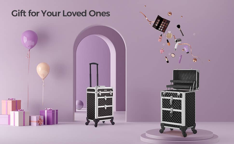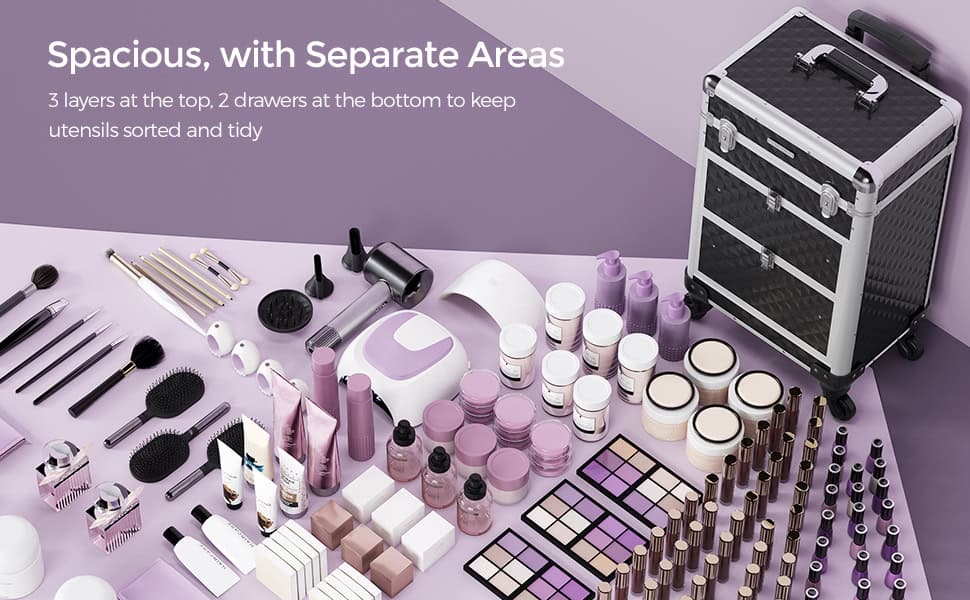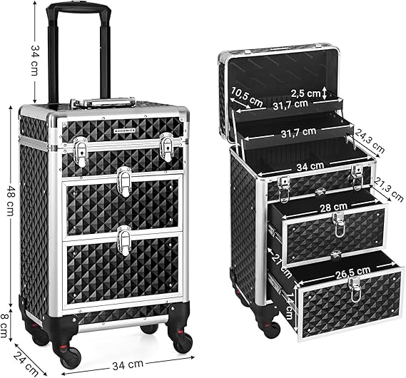 Specificatii: Culoare: Negru Material: Aluminiu, aluminiu Cadru din aluminiu, MDF (panouri din fibre de densitate medie), plastic ABS Dimensiunea produsului: Dimensiune totala (cu roti): 34 x 24 x 56 cm (L x l x i) Dimensiuni generale (fara roti): 34 x 24 x 48 cm (L x l x i) Dimensiunea raftului superior (2x): 32 x 10,5 x 2,3 cm (L x l x i) Dimensiunea sertarului superior: 26,7 x 21,2 x 11,9 cm (L x l x i) Dimensiunea sertarului inferior: 26,7 x 21,2 x 13,9 cm (L x l x i) Greutatea produsului: 6,2 kg Total Max. Capacitate de incarcare statica maxima: 10 kg Despre acest articol Deschideti capacul acestei cutii de machiaj cu chei si straturile superioare se deschid in acelasi timp. Trageti cu usurinta sertarele inferioare cu inchizatoare pentru acces usor la articolele din interior. Fabricata din plastic de calitate, suprafata sa este rezistenta la apa si usor de curatat. Cadrul din aluminiu si protectiile pentru colturi il fac solid si rezistent la socuri (capacitate de incarcare de 10 kg). Intarite cu elemente de fixare hook-and-loop, manerul telescopic este durabil. 3 straturi superioare cu separatoare va pastreaza articolele mici, cum ar fi rujurile si fardurile de ochi, organizate in categorii. 2 sertare inferioare mari sunt pentru uscatorul dvs. de par si lampa de unghii UV. 4 rotite sunt detasabile, usor de instalat si rotative la 360 °, astfel incat sa puteti rula cu usurinta acest troler de frumusete oriunde. Cu cheia inclusa, puteti bloca geanta in timpul deplasarii pentru a preveni caderea articolelor dvs.