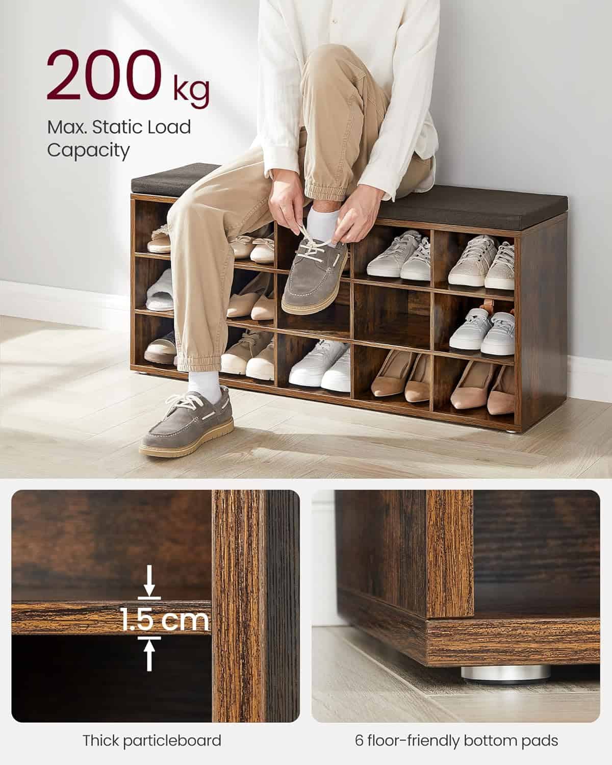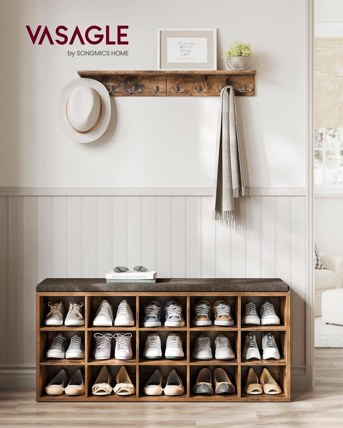 VASAGLE Banca pentru hol cu suport pentru pantofi, 15 compartimente, cu perna, 30x105x48cm, maro rustic Mob360