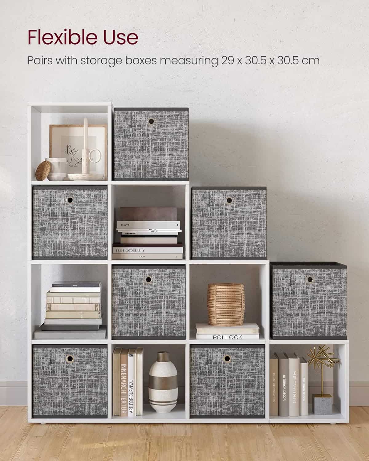 VASAGLE Biblioteca cu 10 compartimente, unitate de depozitare pentru decoratiuni, din lemn, 29x129x129cm, alb Mob360