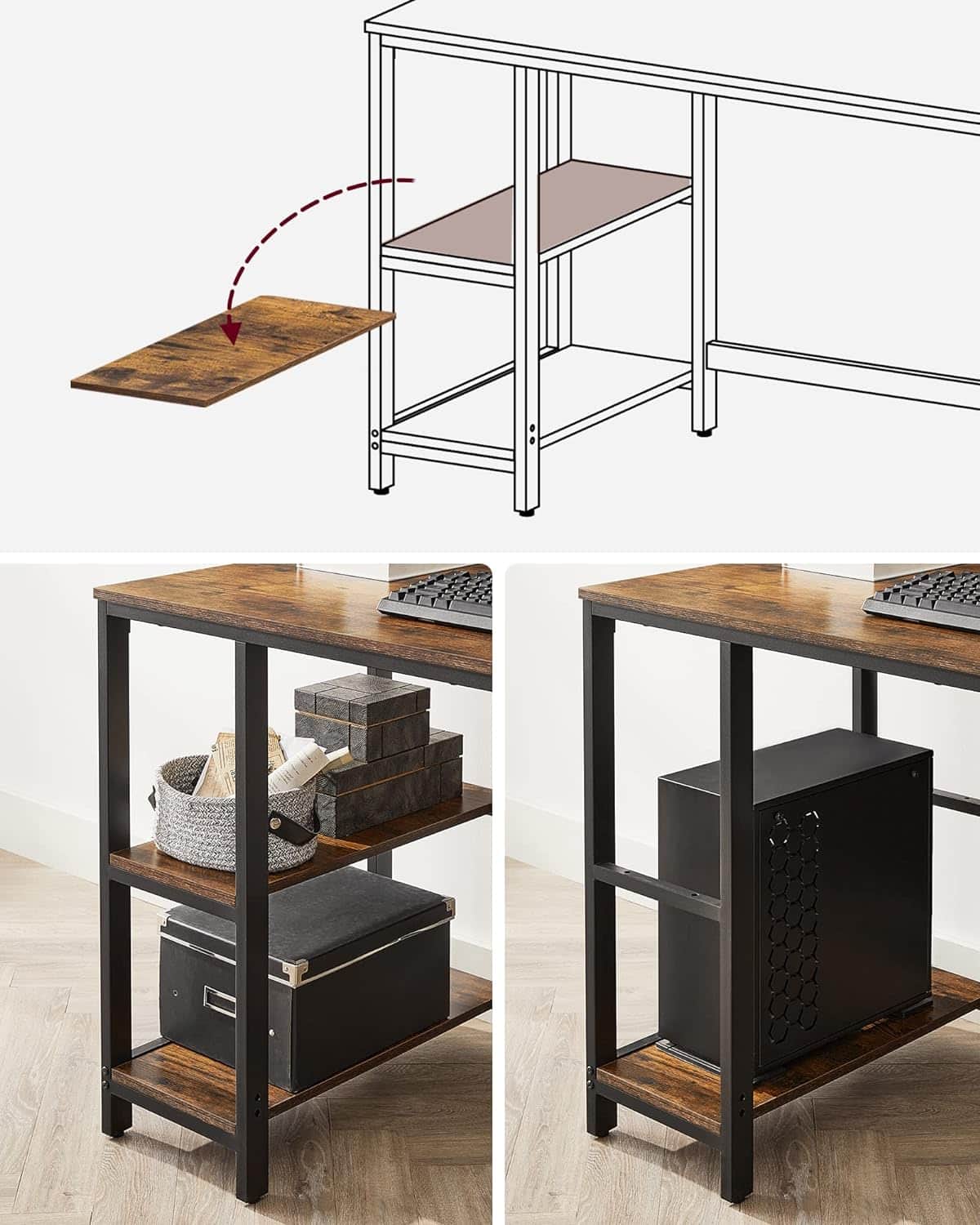 VASAGLE Birou cu 2 rafturi pe stanga sau dreapta, cadru din otel, 60x120x75cm, industrial, maro rustic si negru Mob360 – produs disponibil în magazinul Mob360.