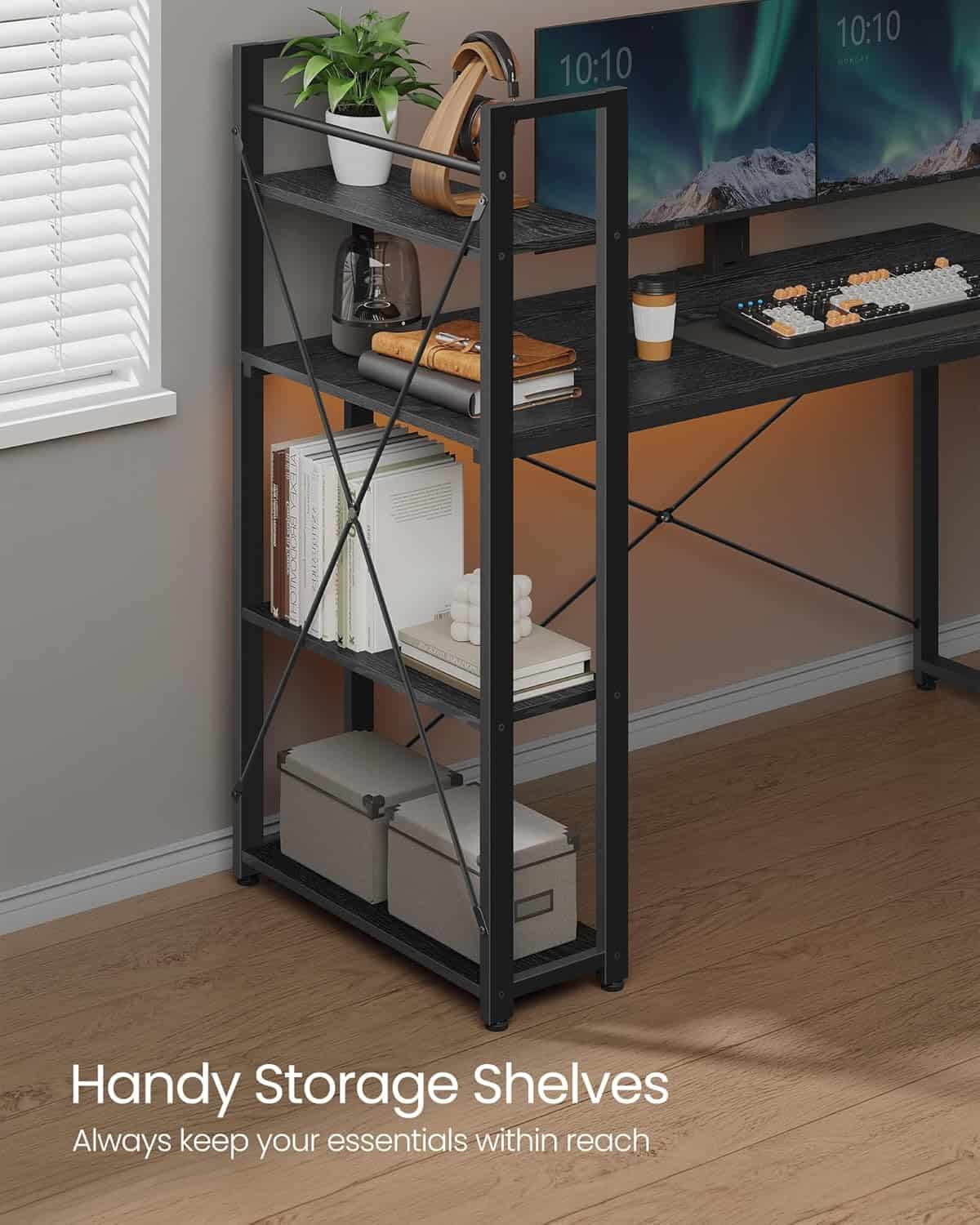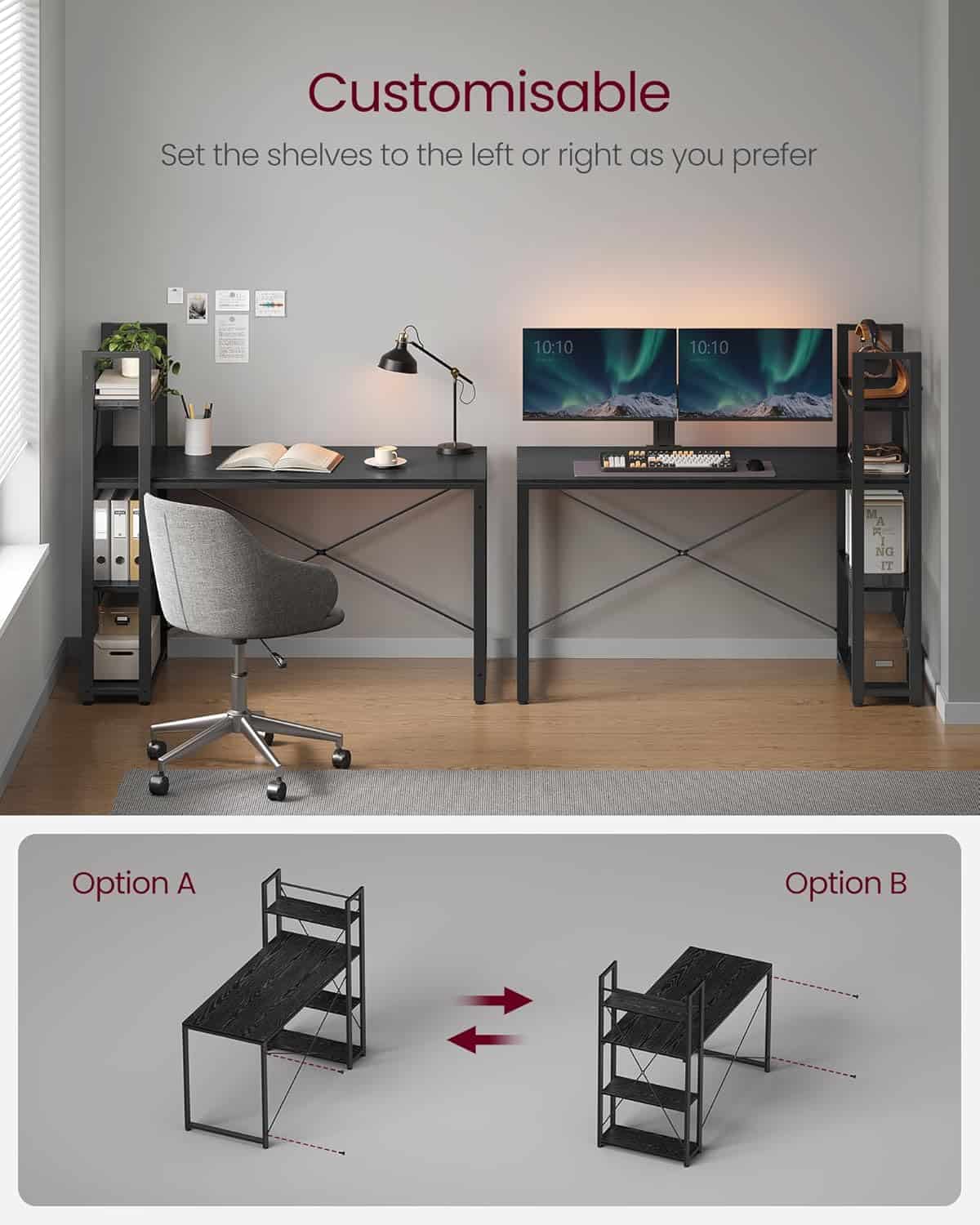 VASAGLE Birou cu raft lateral, montare stanga sau dreapta, industrial, 60x132x119 cm, negru Mob360