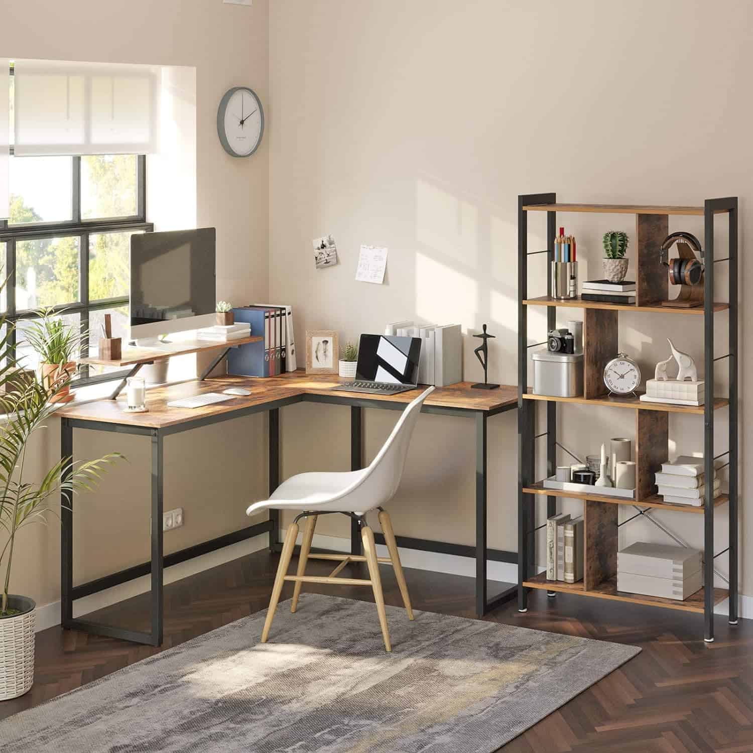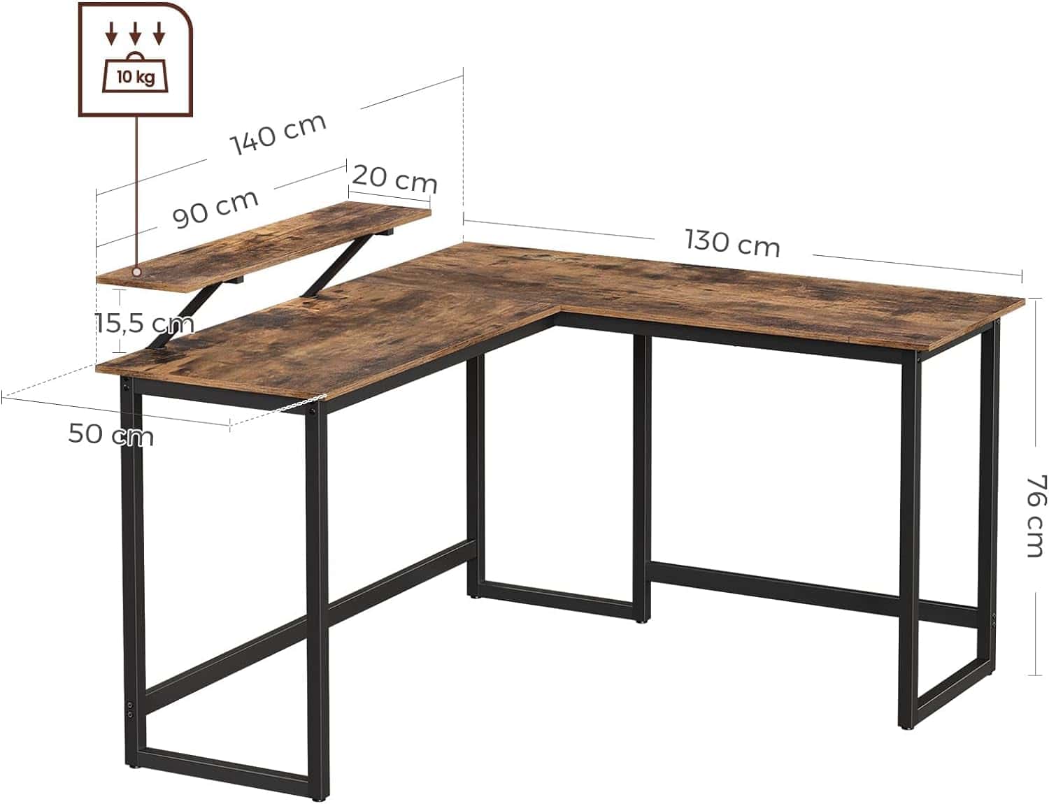 VASAGLE Birou in forma de L cu suport pentru monitor, cadru metalic, 140x130x76cm, maro rustic Mob360 este disponibil în magazinul Mob360.
