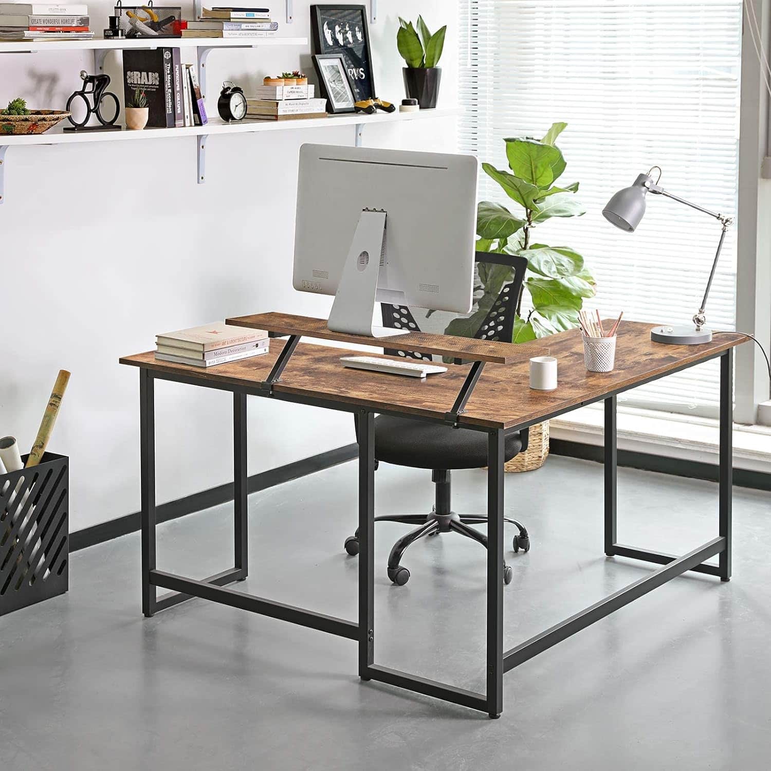 VASAGLE Birou in forma de L cu suport pentru monitor, cadru metalic, 140x130x76cm, maro rustic Mob360