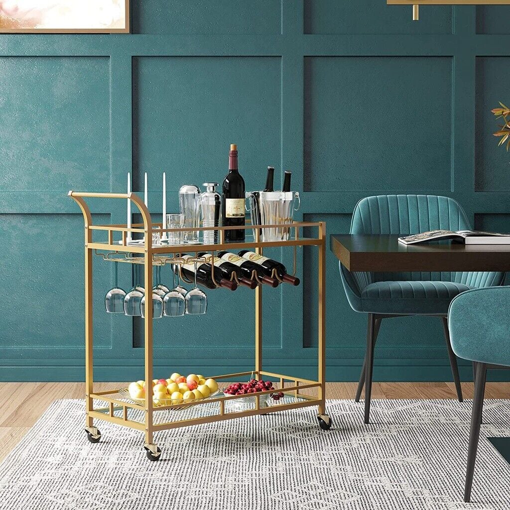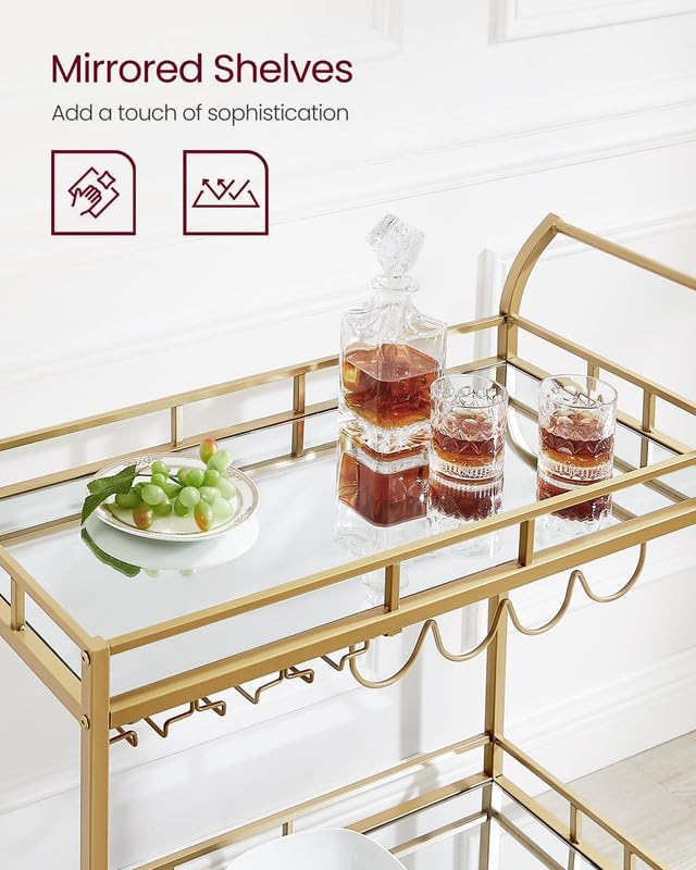 Cu 2 randuri de suporturi pentru pahare si 4 suporturi pentru vin, acestea vor fi bine ingrijite aici inainte de urmatoarea ta cina romantica.Plimba-l oriunde este nevoie, la petrecerea ta sau parcheaza-l langa canapea pentru cafeaua de dupa petrecere— cu 4 roti, dintre care 2 se pot incuia, acest carucior de bar este intotdeauna la dispozitie.Dispunand de un cadru auriu elegant, rafturi cu oglinda si un maner curbat elegant, acest carucior de servire este o sansa buna de a-ti expune stilul in timp ce iti imbogatesti zona de bar, sala de mese sau bucataria.Instructiuni pas cu pas, piese etichetate si unelte incluse — acest carucior de vin mobil vine cu totul pentru a va ajuta sa il configurati inainte sa va dati seama.