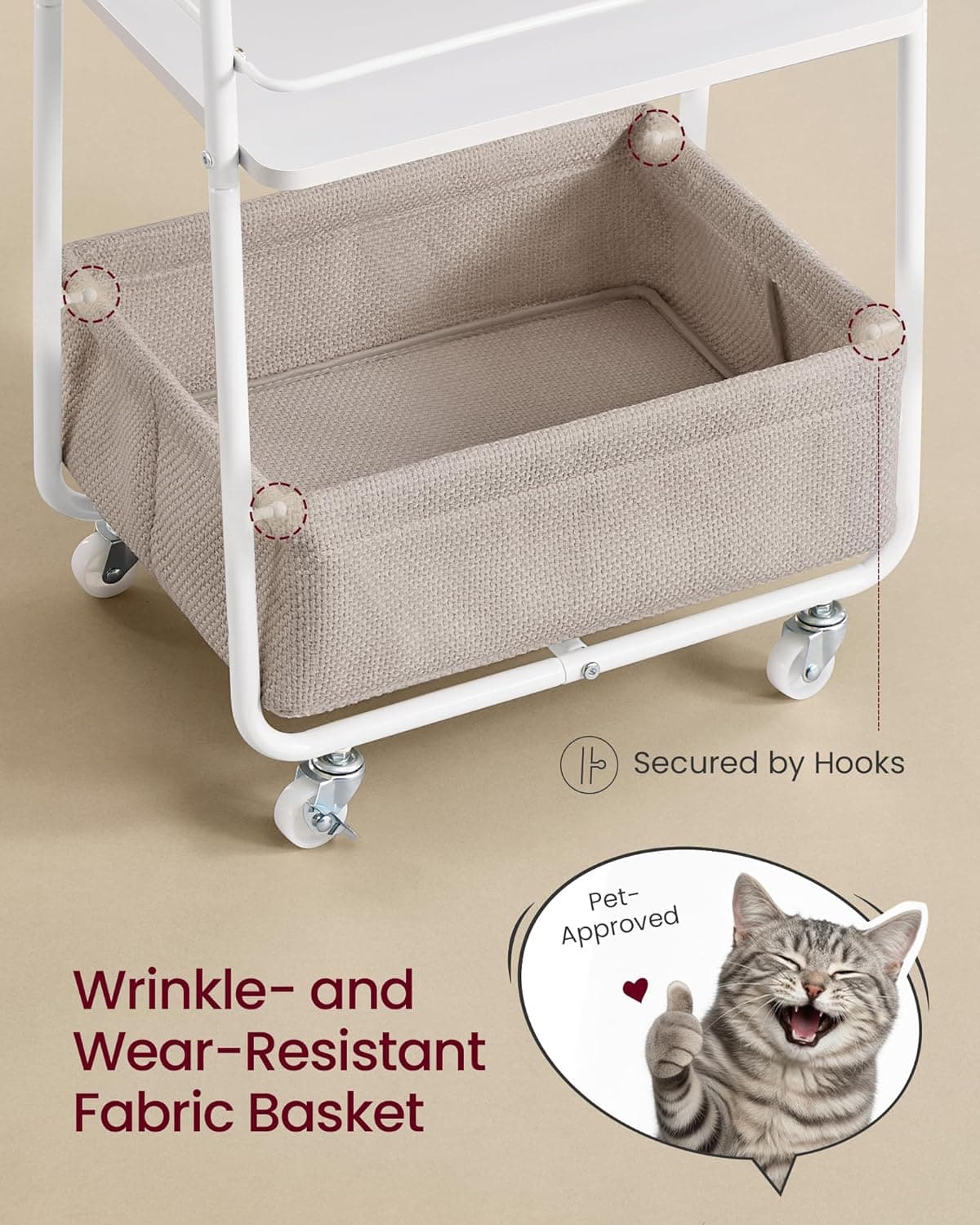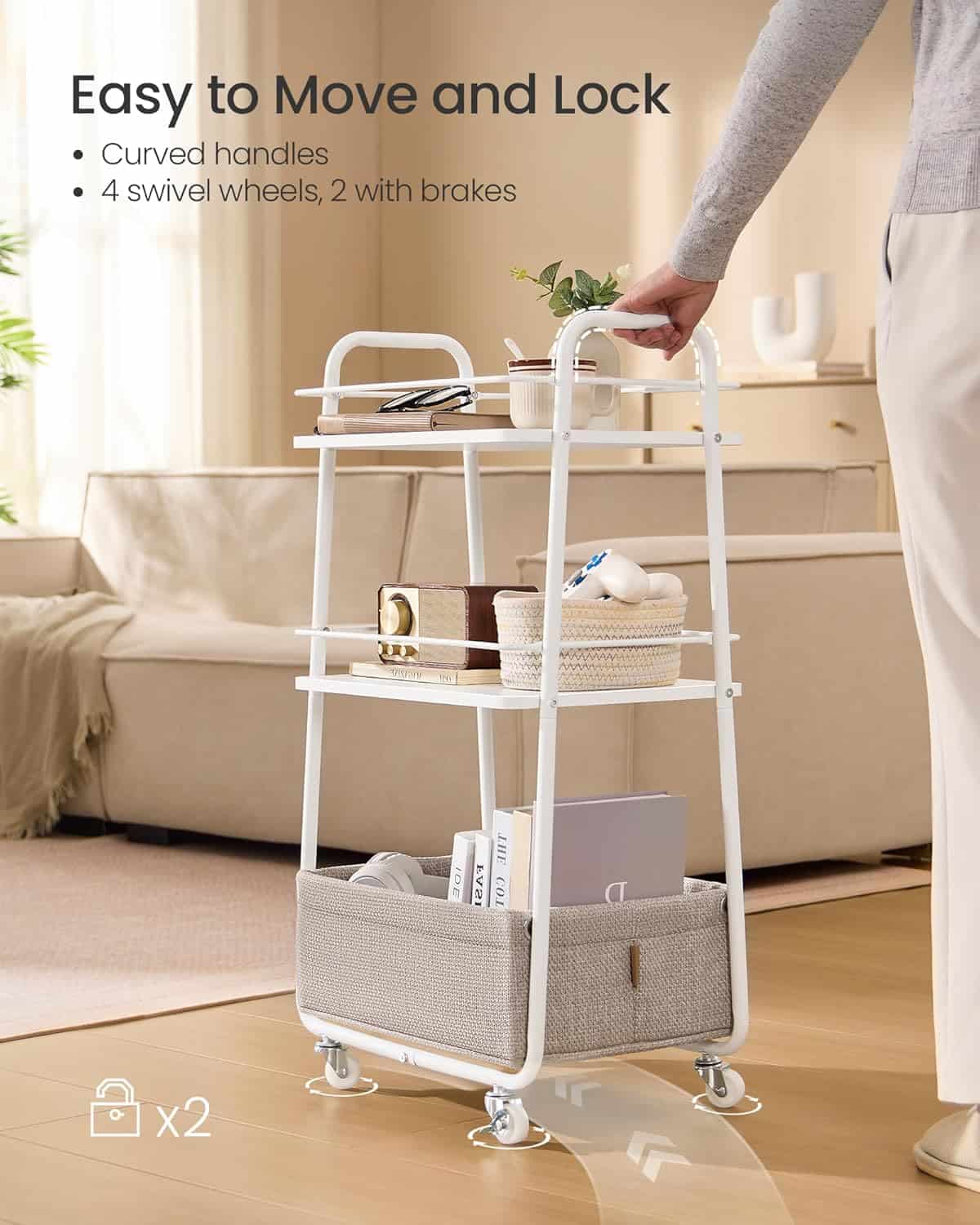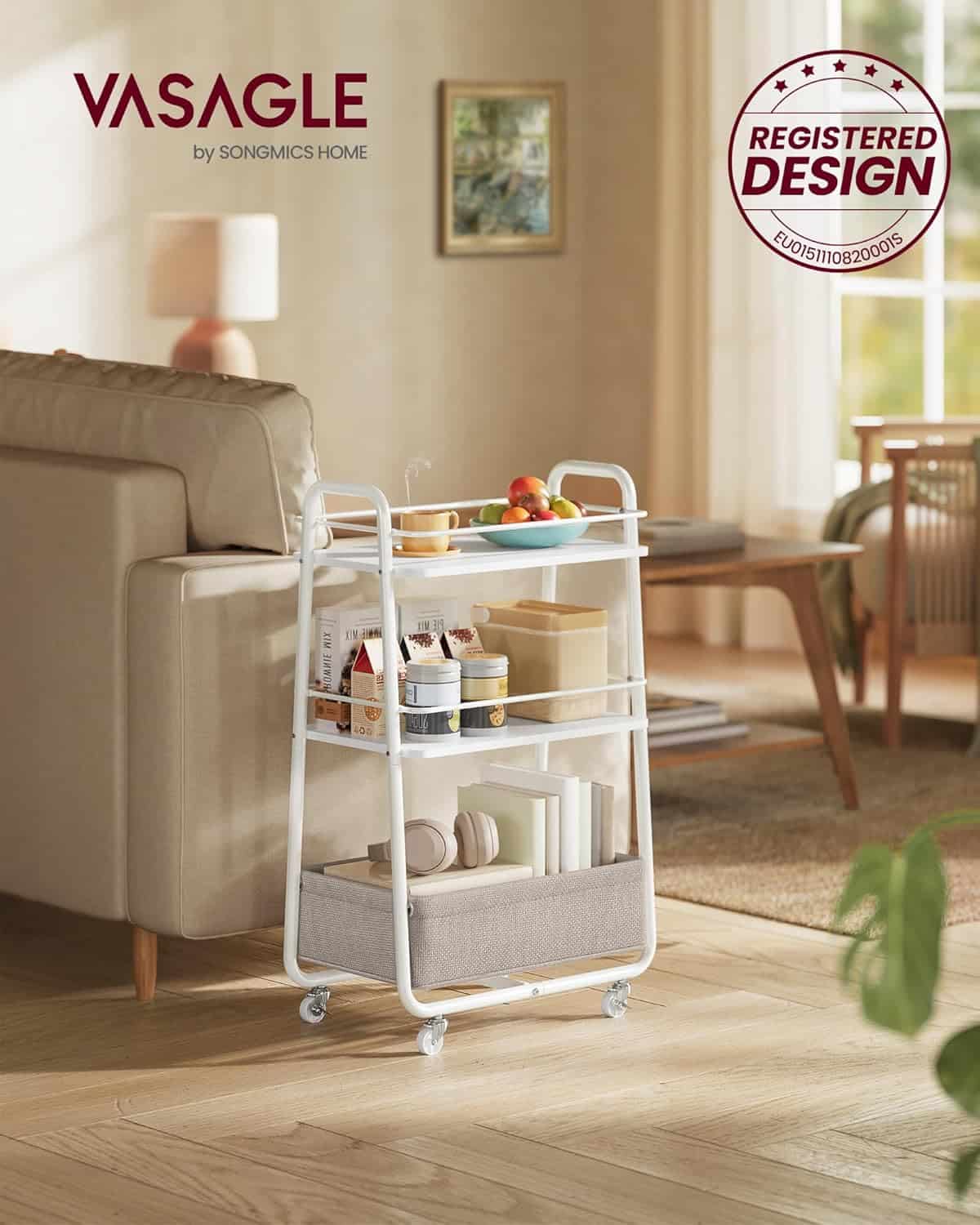 VASAGLE Carucior depozitare cu roti si cos textil, 3 niveluri, PAL si cadru metalic, alb si crem Mob360 – produs disponibil în magazinul Mob360.
