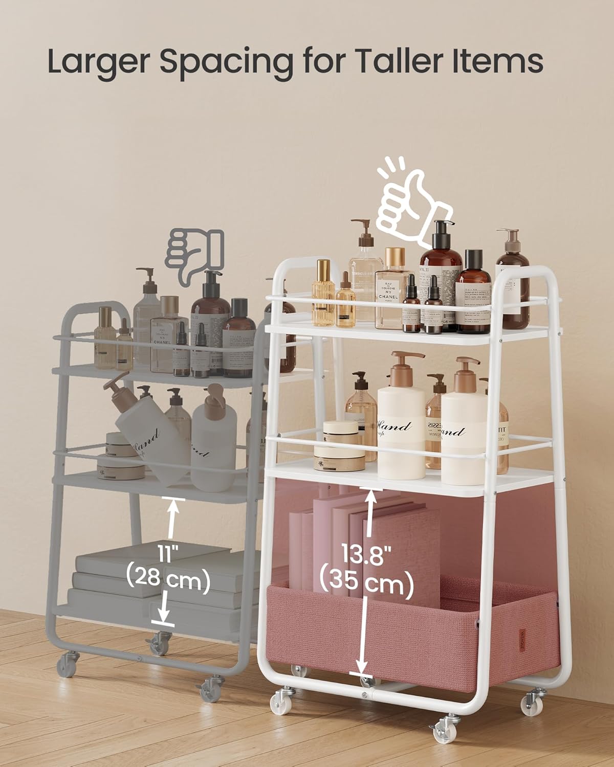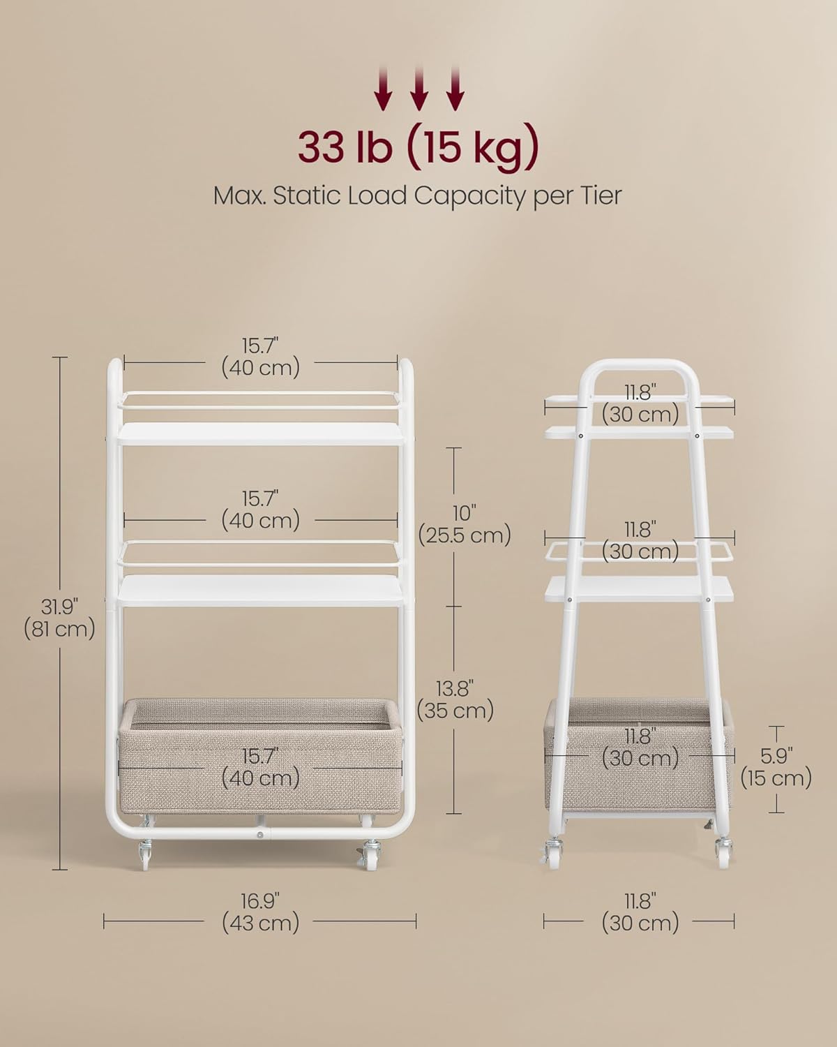 VASAGLE Carucior depozitare cu roti si cos textil, 3 niveluri, PAL si cadru metalic, alb si crem Mob360
