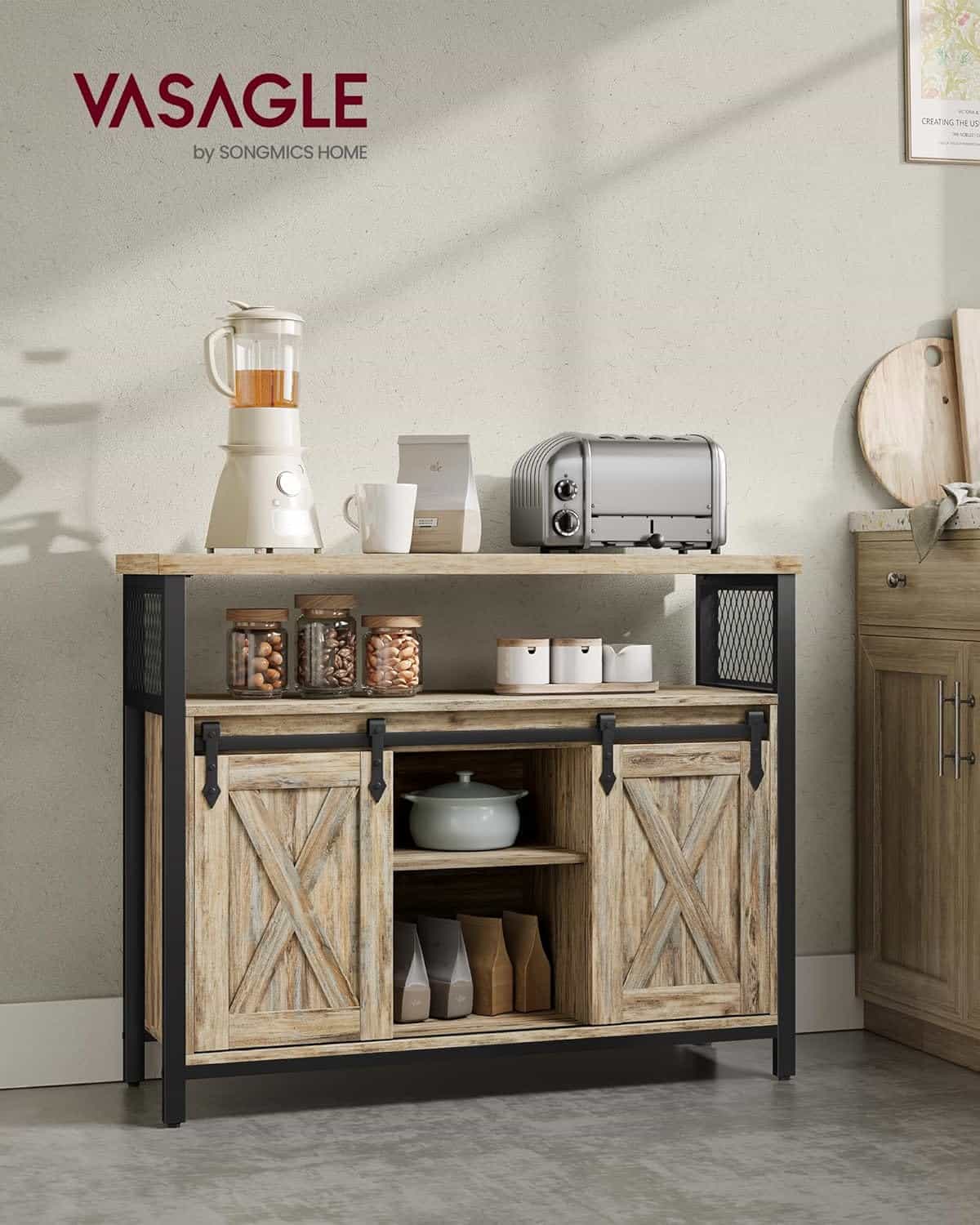 VASAGLE Comoda pentru living sau bucatarie, cu 2 usi glisante, rafturi reglabile, stil rustic, 33x100x80 cm, maro natur Mob360 – produs disponibil în magazinul Mob360.
