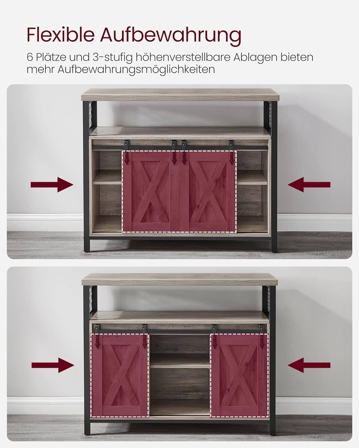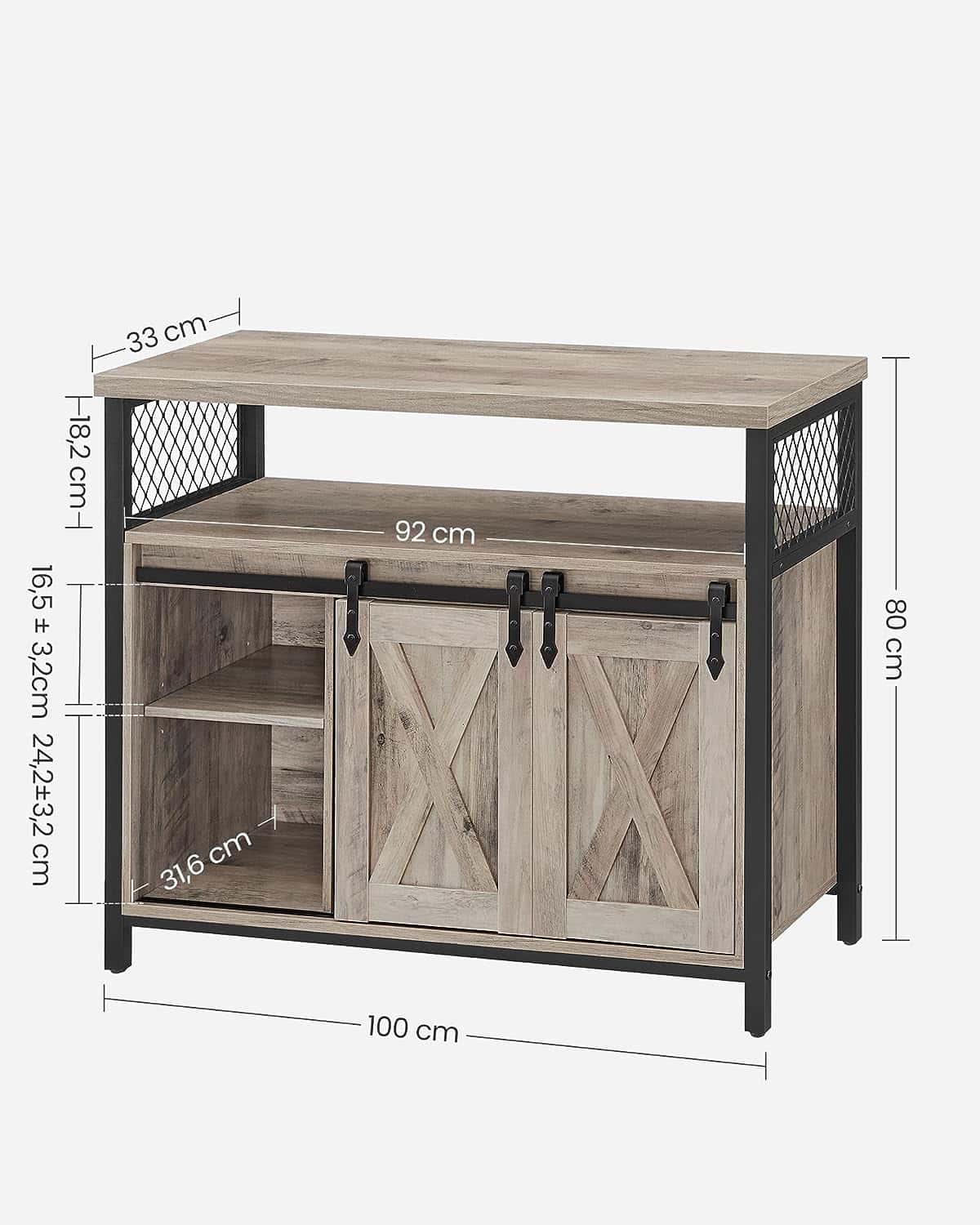 Culoare: Gri Material: Placi aglomerate din lemn, otel Dimensiuni: 100 x 33 x 80 cm (L x l x ih). Greutate: 24,7 kg. Capacitate de incarcare statica a suprafetei: 15 kg. Capacitate de incarcare statica a raftului deschis: 15 kg. Capacitatea de incarcare statica a raftului interior: 15 kg. Despre acest articol Usile glisante in stil hambar si designul simetric confera acestui dulap de bucatarie un stil rustic care poate fi integrat in diverse stiluri de decor interior.6 compartimente cu 3 rafturi reglabile pe inaltime gazduiesc articole de diferite dimensiuni. Blatul de masa de 33 x 100 cm ofera o alta optiune de depozitare.Combinatia dintre un cadru din otel si un panou de particule de inalta calitate ofera o mare stabilitate si rezistenta. Picioarele reglabile mentin dulapul echilibrat, iar kitul anti-inclinare ofera un plus de stabilitate.Utilizati acest dulap de depozitare ca si masuta in bucatarie, dulap pentru televizor in camera de zi sau dulap de arhivare in biroul de acasa.Piesele numerotate si instructiunile clare va vor ajuta sa finalizati asamblarea acestui dulap de bucatarie intr-o clipa.De asemenea, sunt incluse piese de schimb pentru inlocuire.