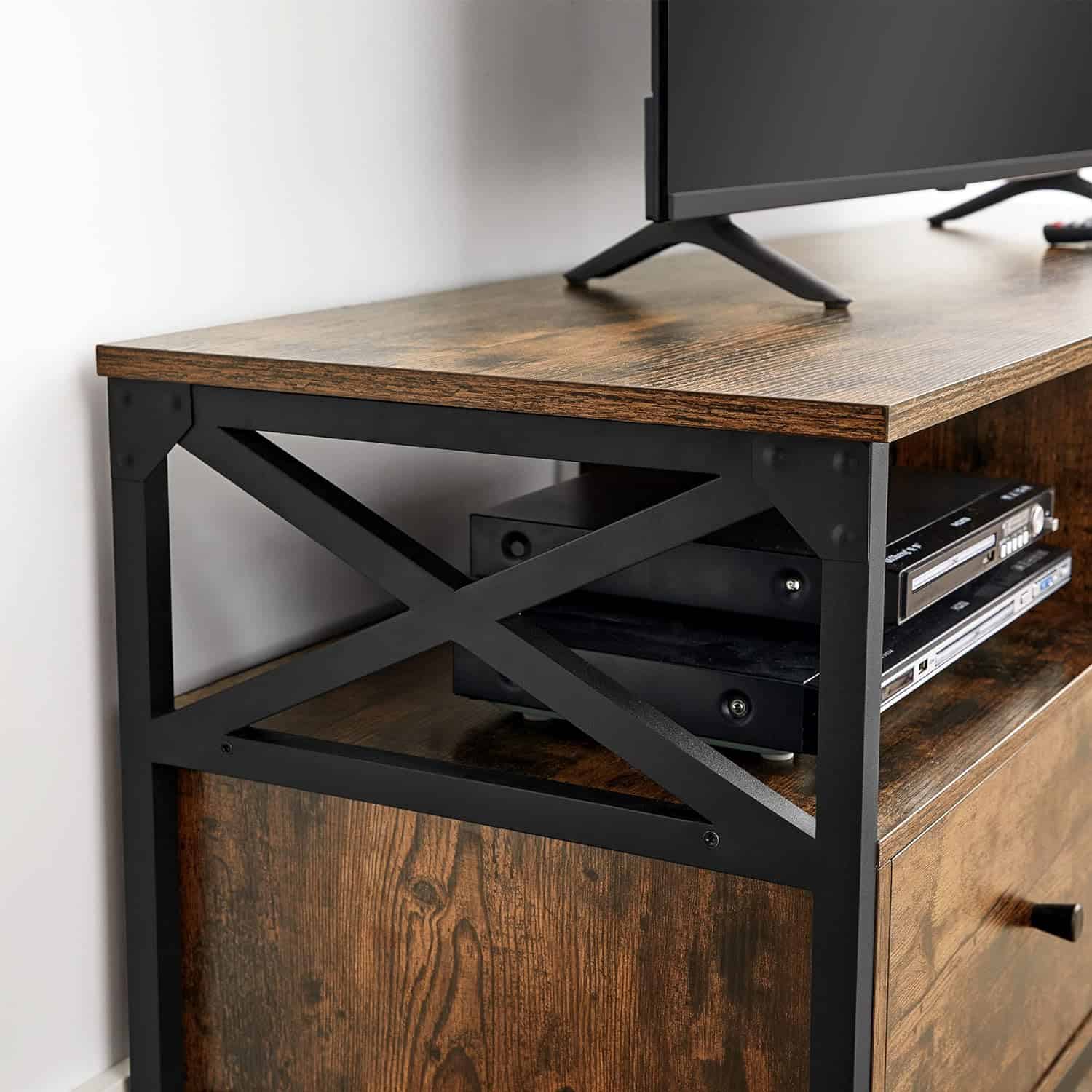 VASAGLE Comoda pentru TV de pana la 65 inch, cu 3 sertare si 3 rafturi deschise, 40x147x50cm, maro rustic si negru Mob360 – produs disponibil în magazinul Mob360.