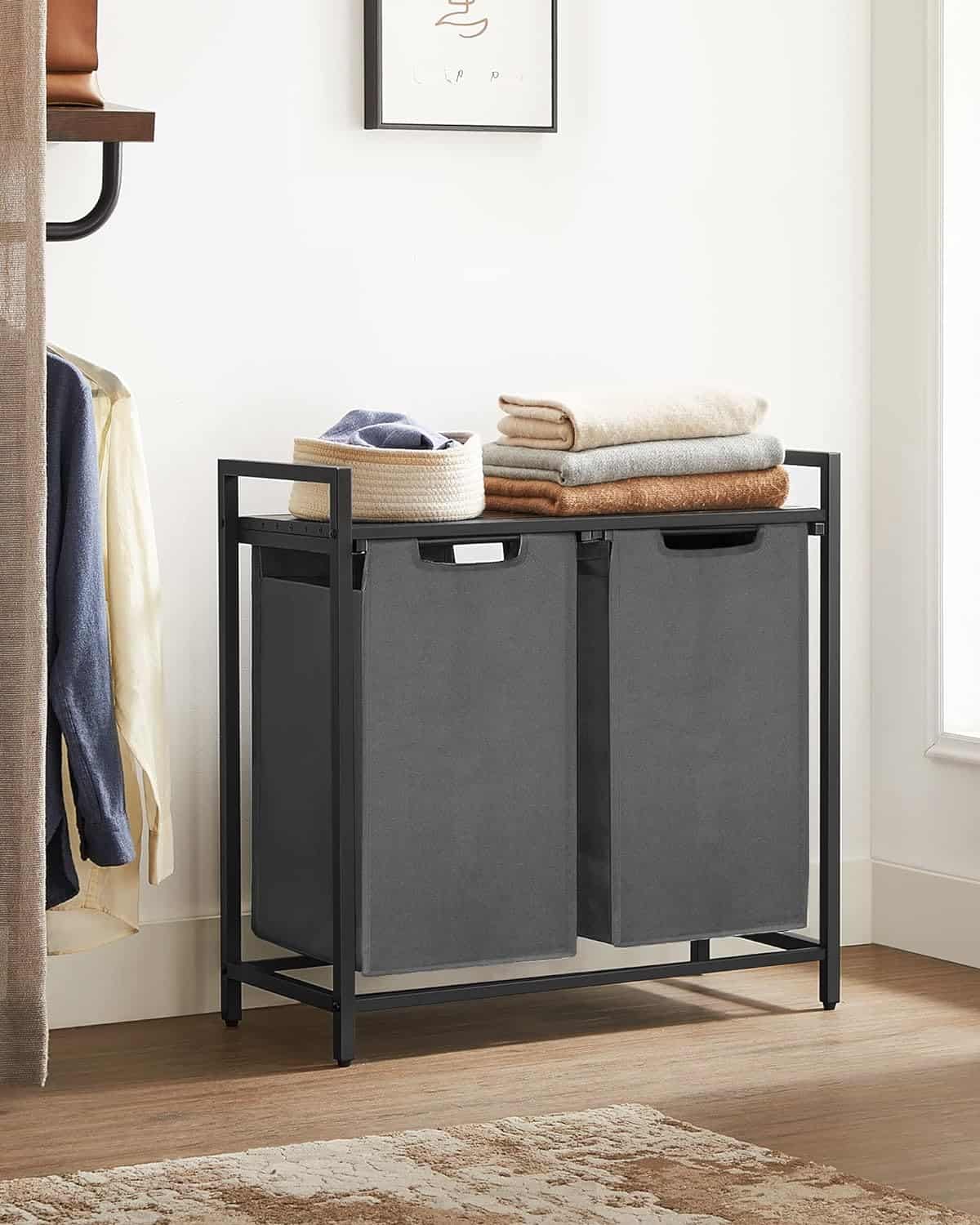 VASAGLE Cos de rufe, 2 compartimente, saci de rufe detasabili, raft, cadru metalic, 2x46L, 73x33x72 cm, maro rustic si gri Mob360 – produs disponibil în magazinul Mob360.
