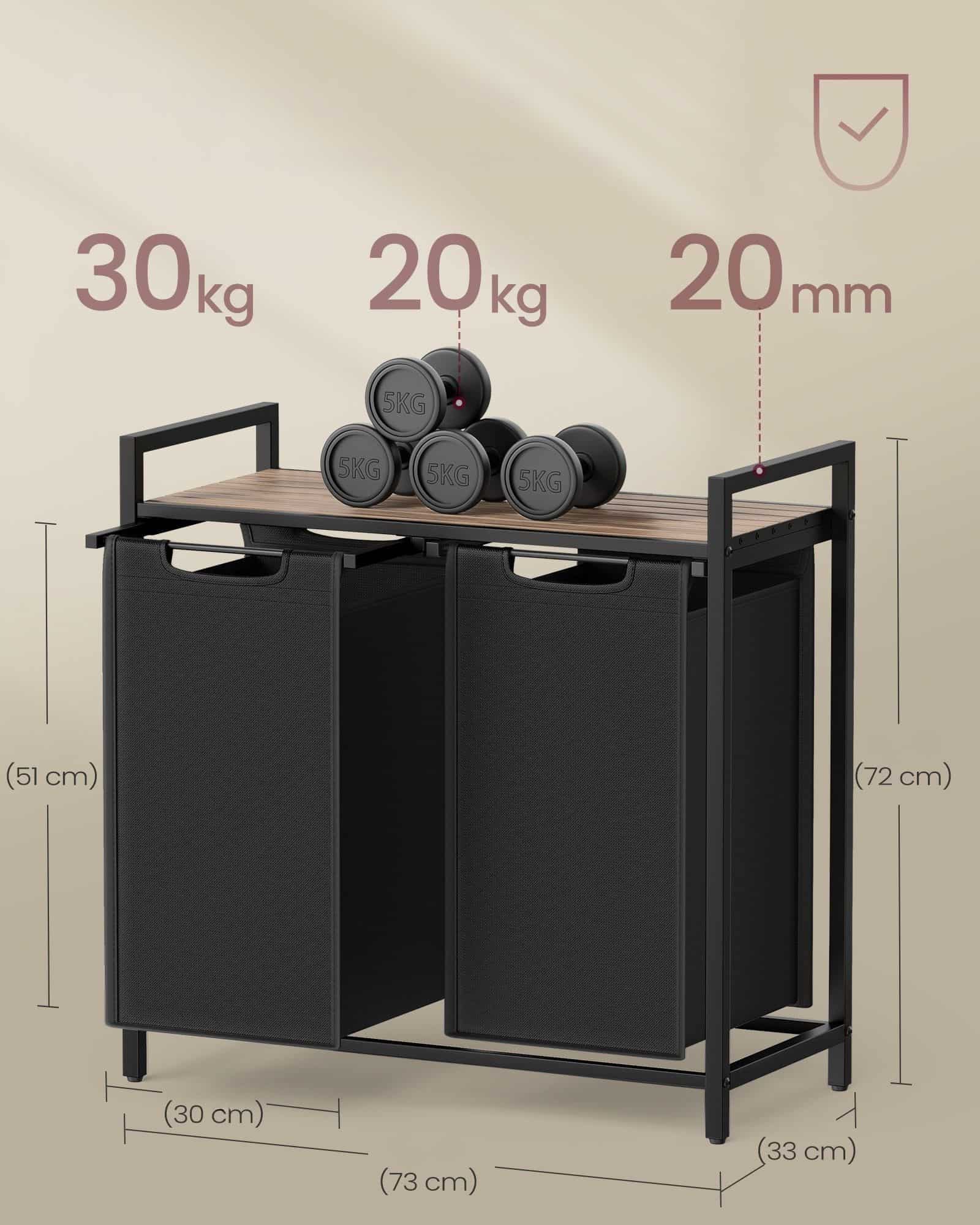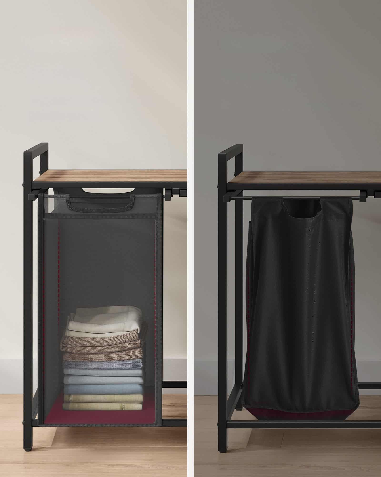 VASAGLE Cos de rufe, 2 compartimente, saci de rufe detasabili, raft, cadru metalic, 2x46L, 73x33x72 cm, maro si negru Mob360 – produs disponibil în magazinul Mob360.