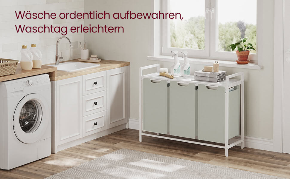 VASAGLE Cos de rufe, 3 compartimente, saci de rufe detasabili, raft, cadru metalic, 3x38L, 93x33x72 cm, alb Mob360 – produs disponibil în magazinul Mob360.