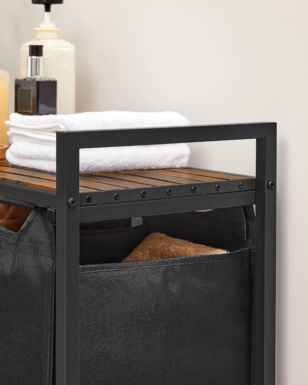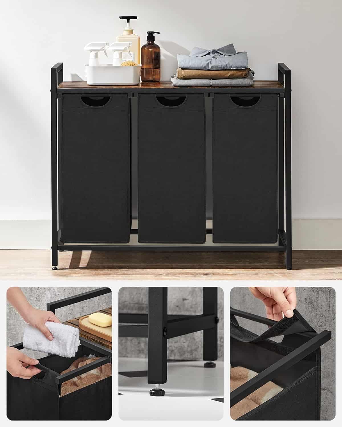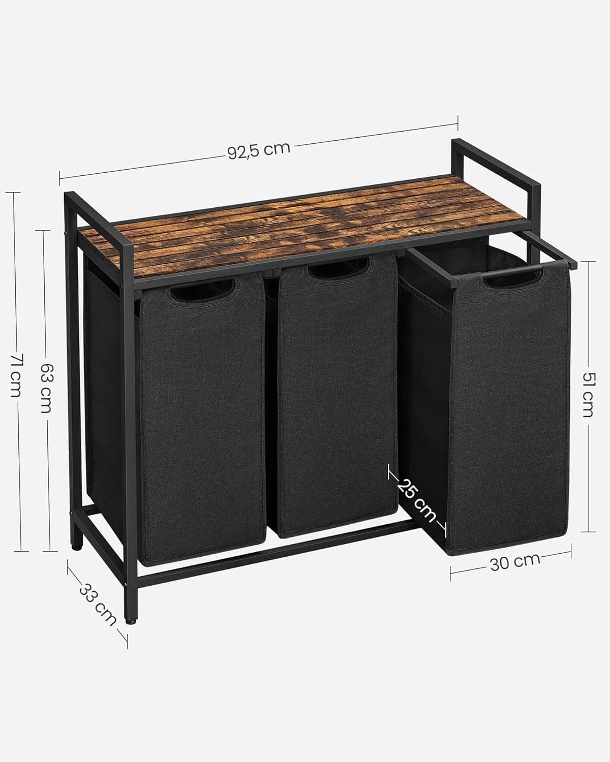 VASAGLE Cos de rufe, 3 compartimente, saci de rufe detasabili, raft, cadru metalic, 3x38L, 93x33x72 cm, maro rustic si negru Mob360