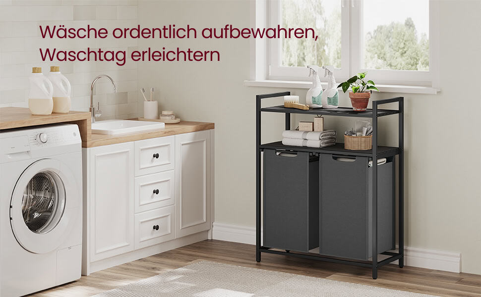 VASAGLE Cos de rufe, cu 2 saci detasabili, 2 rafturi, capacitate de 46L per sac, 73x33x92cm , negru si gri Mob360