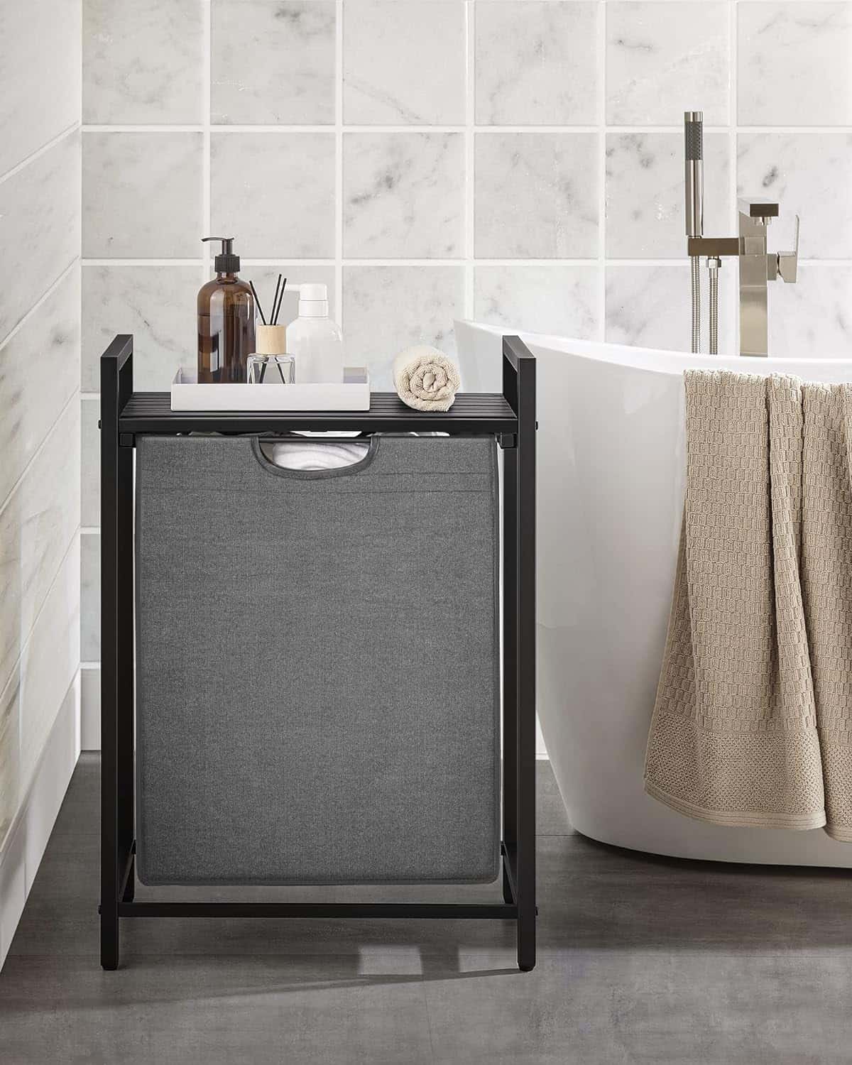 VASAGLE Cos de rufe, sac de rufe detasabil, raft, cadru metalic, 65L, 50x33x72 cm, negru si gri Mob360