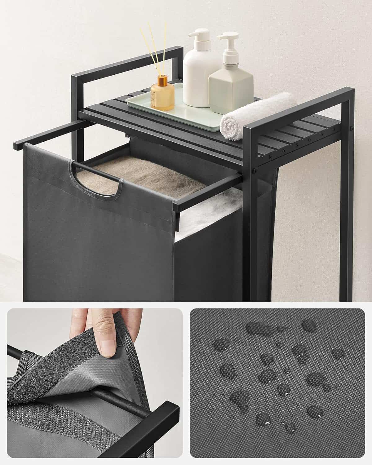 VASAGLE Cos de rufe, sac de rufe detasabil, raft, cadru metalic, 65L, 50x33x72 cm, negru si gri Mob360 este disponibil în magazinul Mob360.