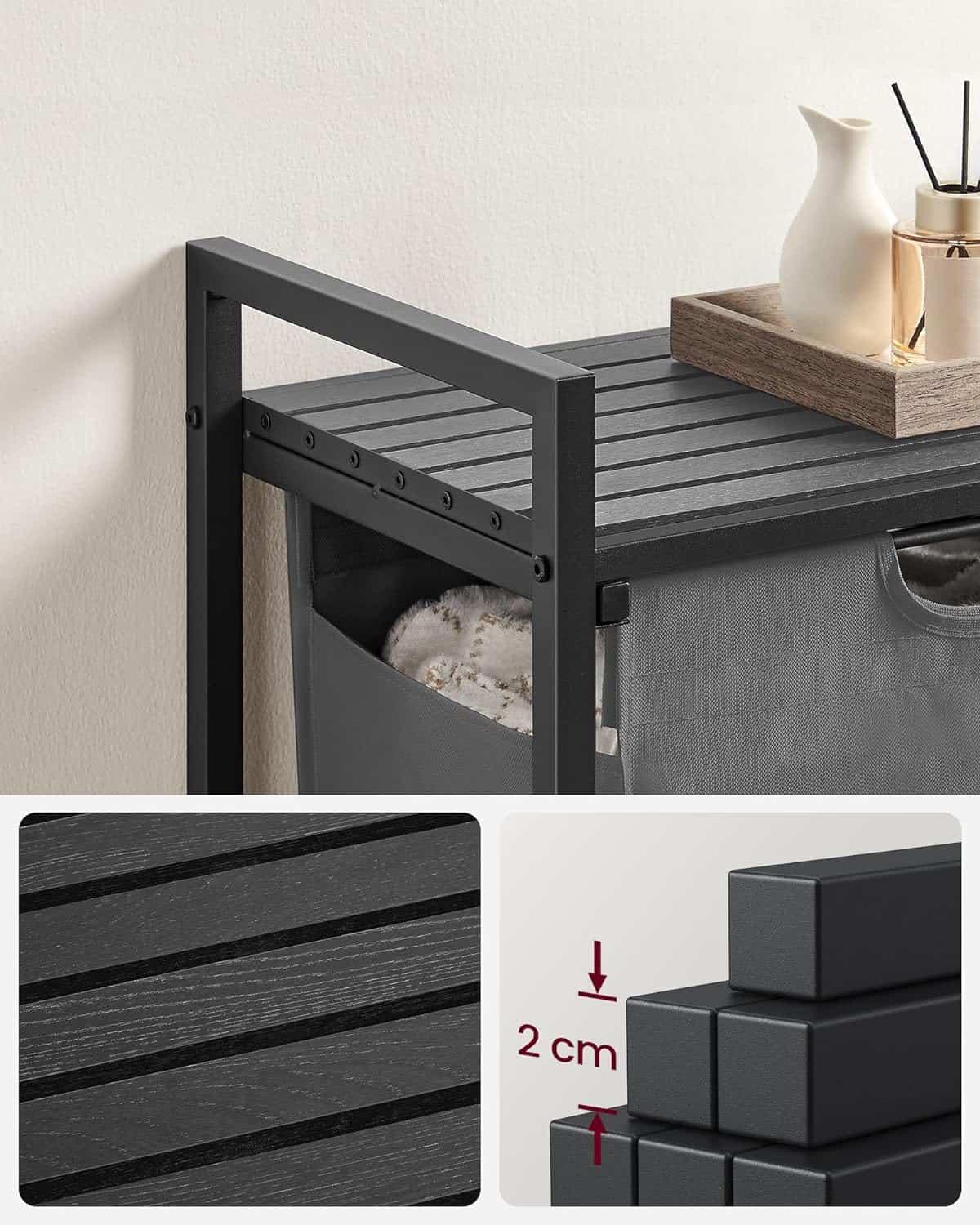 Designul sau cu sipci permite aerului sa circule pentru o buna ventilatie, prevenind acumularea de mirosuri de la rufe Captuseala extrasa si detasabila: Captuseala este echipata cu un panou inferior din plastic pentru a preveni caderea si, datorita dispozitivului de fixare cu carlig si bucla, puteti scoate si indeparta fara efort captuseala pentru a o transporta cu usurinta la masina de spalat.Fabricat cu un cadru din tub de otel de 2 cm si panou MDF, acest cos de rufe suporta pana la 20 kg pe raftul superior.