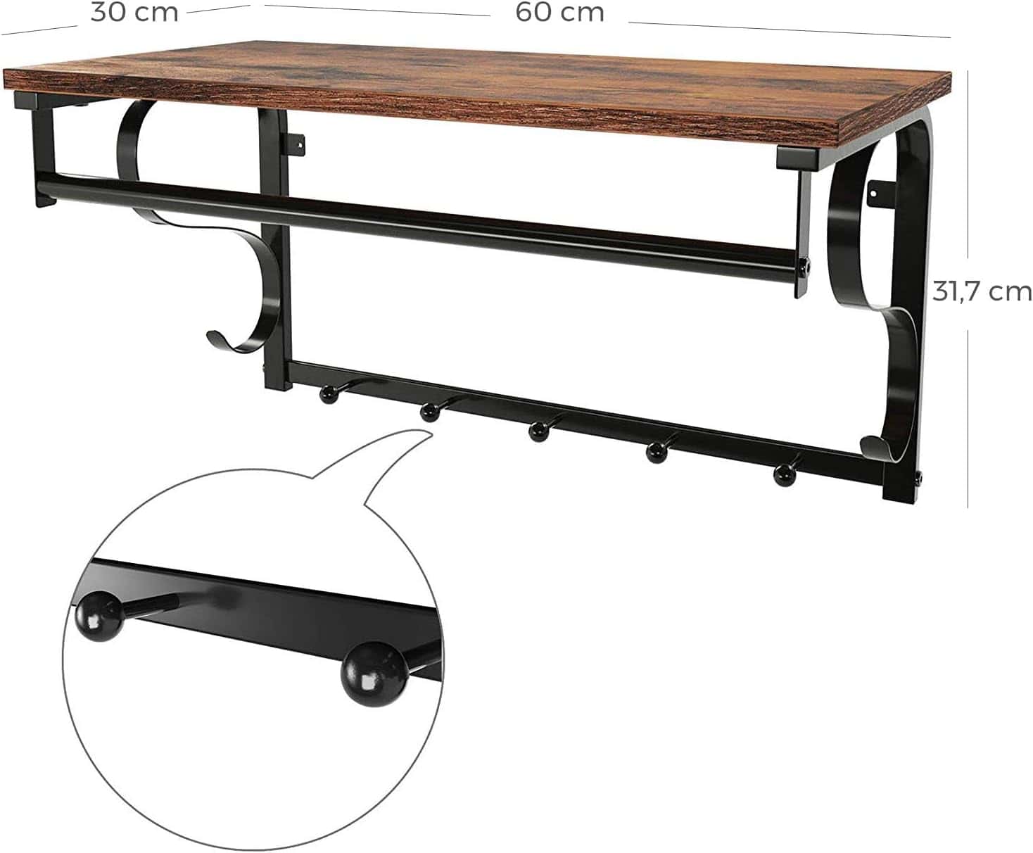 VASAGLE Cuier de perete cu raft de depozitare si sina, 5 carlige, 30x60x32 cm, maro rustic Mob360