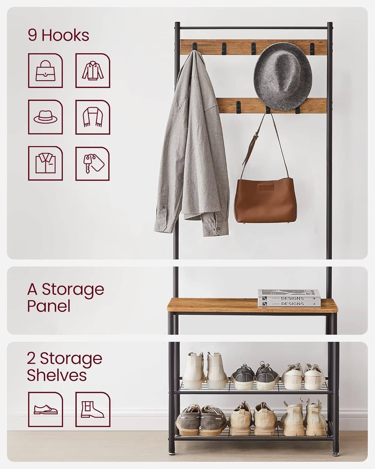 VASAGLE Cuier hol 3 in 1 cu banca si raft pantofi, cadru metalic si PAL, 70x32x177 cm, maro nuc si negru Mob360