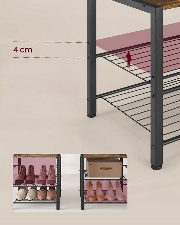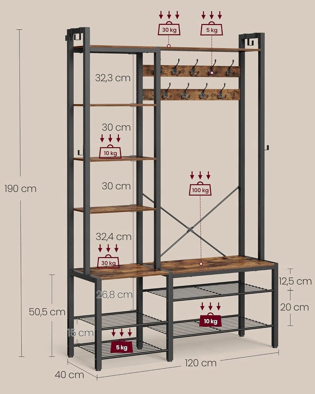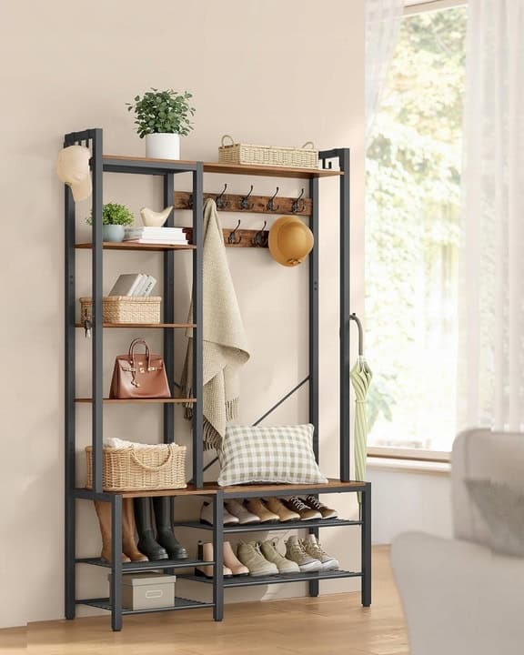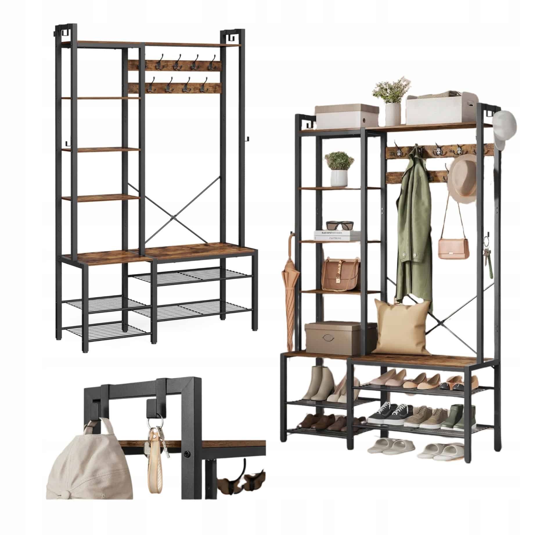 VASAGLE Cuier hol 4 in 1 cu banca, pantofar si rafturi, cadru metalic, stil industrial, 40x120x190 cm, maro rustic Mob360