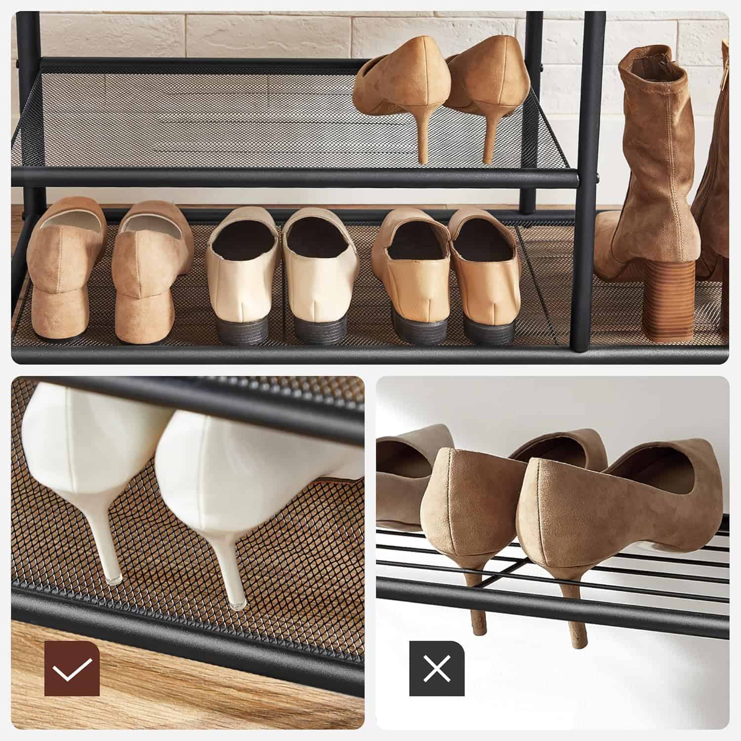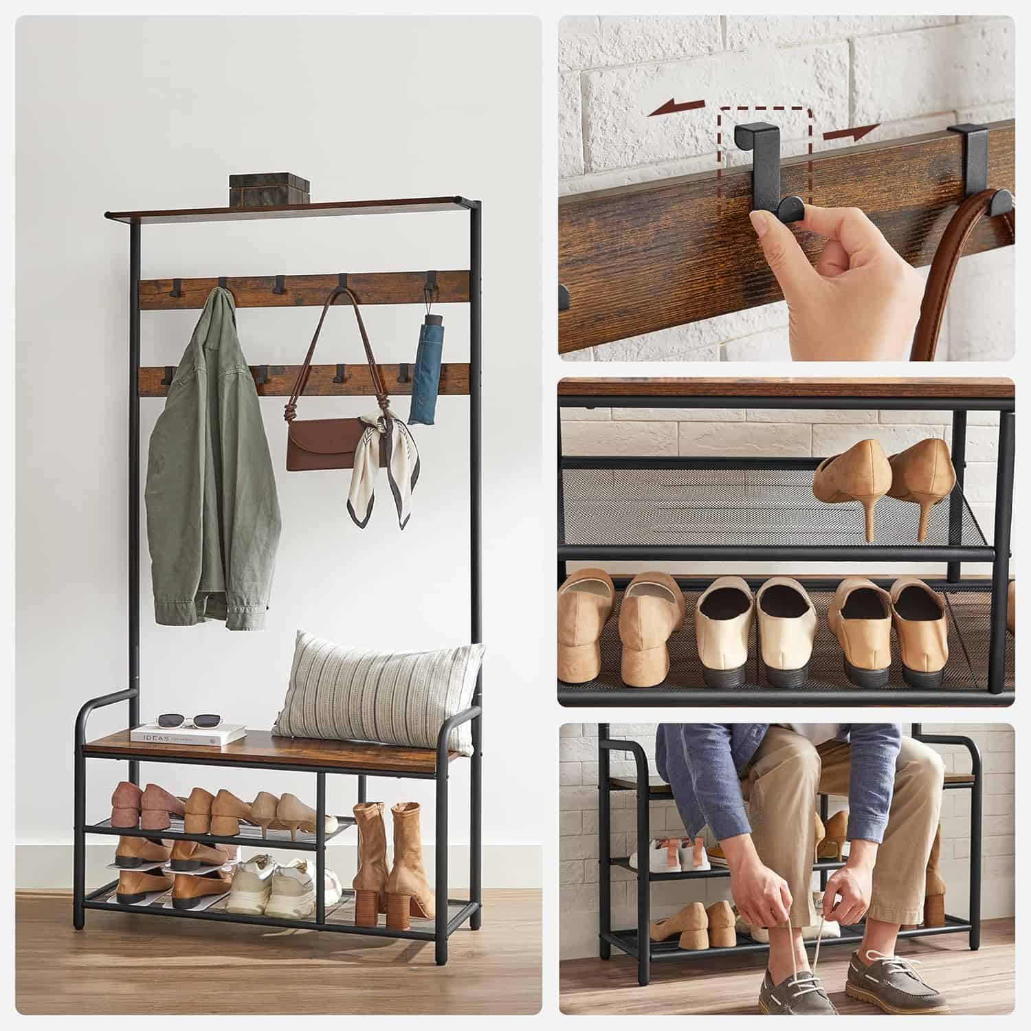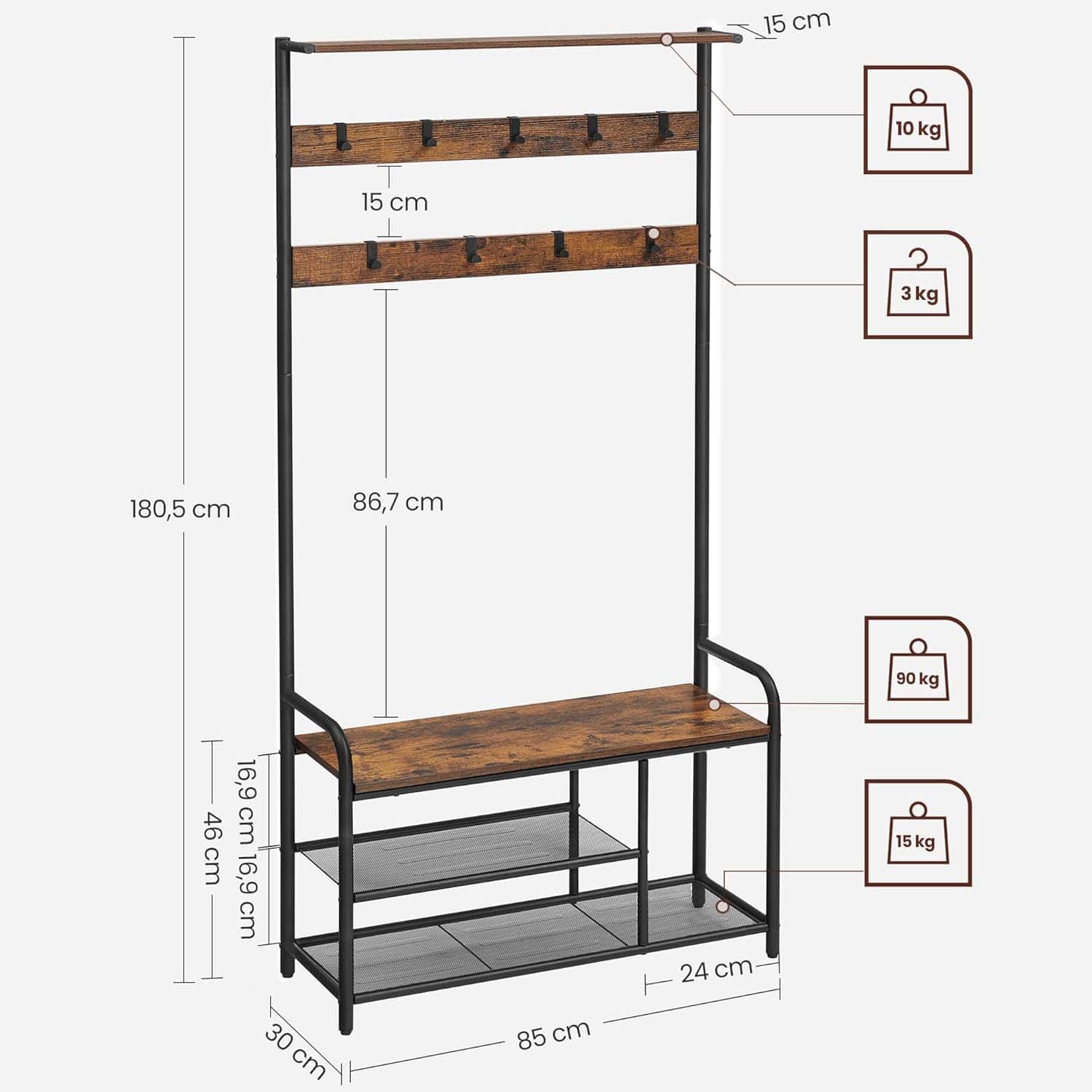 VASAGLE Cuier hol cu banca si raft pantofi, 9 carlige, cadru metalic, stil industrial, 85x30x181 cm, maro rustic Mob360