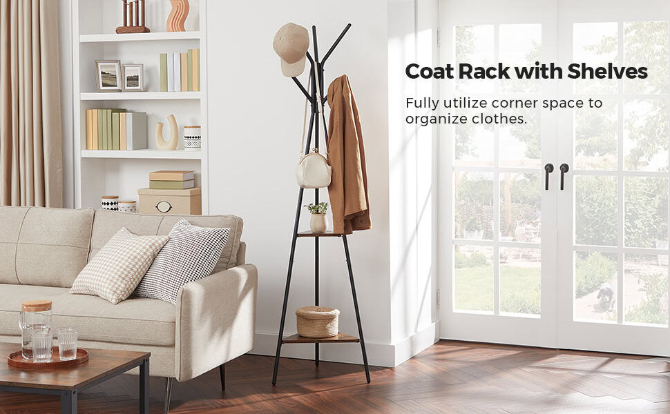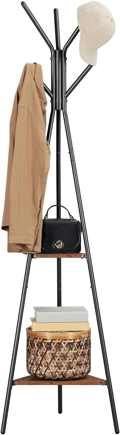 VASAGLE Cuier metalic, cu 2 rafturi MDF, inaltime 179cm, stil industrial, maro rustic si negru Mob360