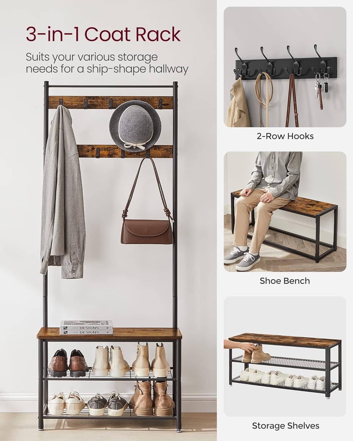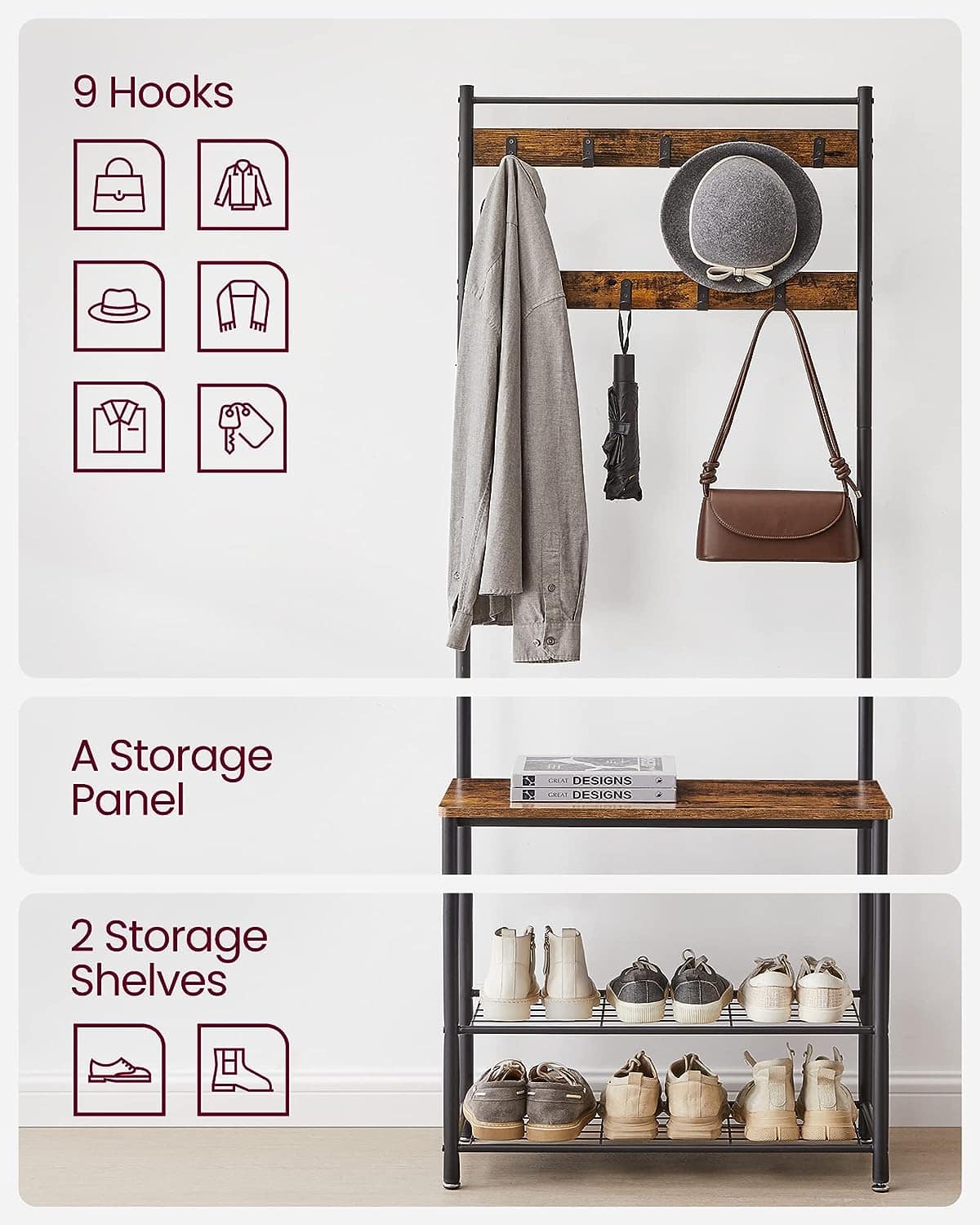 de a agata haine, de a organiza pantofii si de a va aseza pentru a va incalta sau a va scoate pantofii 9 carlige metalice rezistente la rugina in 2 randuri, fiecare suportand pana la 3 kg, sunt robuste si durabile, oferind o multime de spatiu de agatat pentru paltoane, genti, palarii, esarfe si alte articole de dus-intors – perfecte pentru utilizare pe termen lung Sustinut de un cadru robust din otel si nivelat de 4 picioare reglabile, acest suport de haine pentru hol ofera un suport stabil pentru obiectele dvs.; kitul anti-inclinare inclus imbunatateste stabilitatea generala Bancuta acestui suport pentru haine va permite sa va asezati cu usurinta datorita capacitatii de greutate de 90 kg.