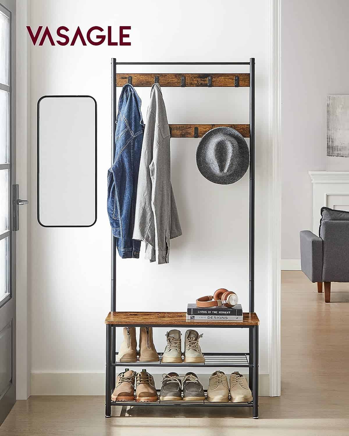 VASAGLE Cuier pentru haine cu banc de depozitare a pantofilor, cadru din otel, 32x70x177cm, industrial, maro rustic si negru Mob360