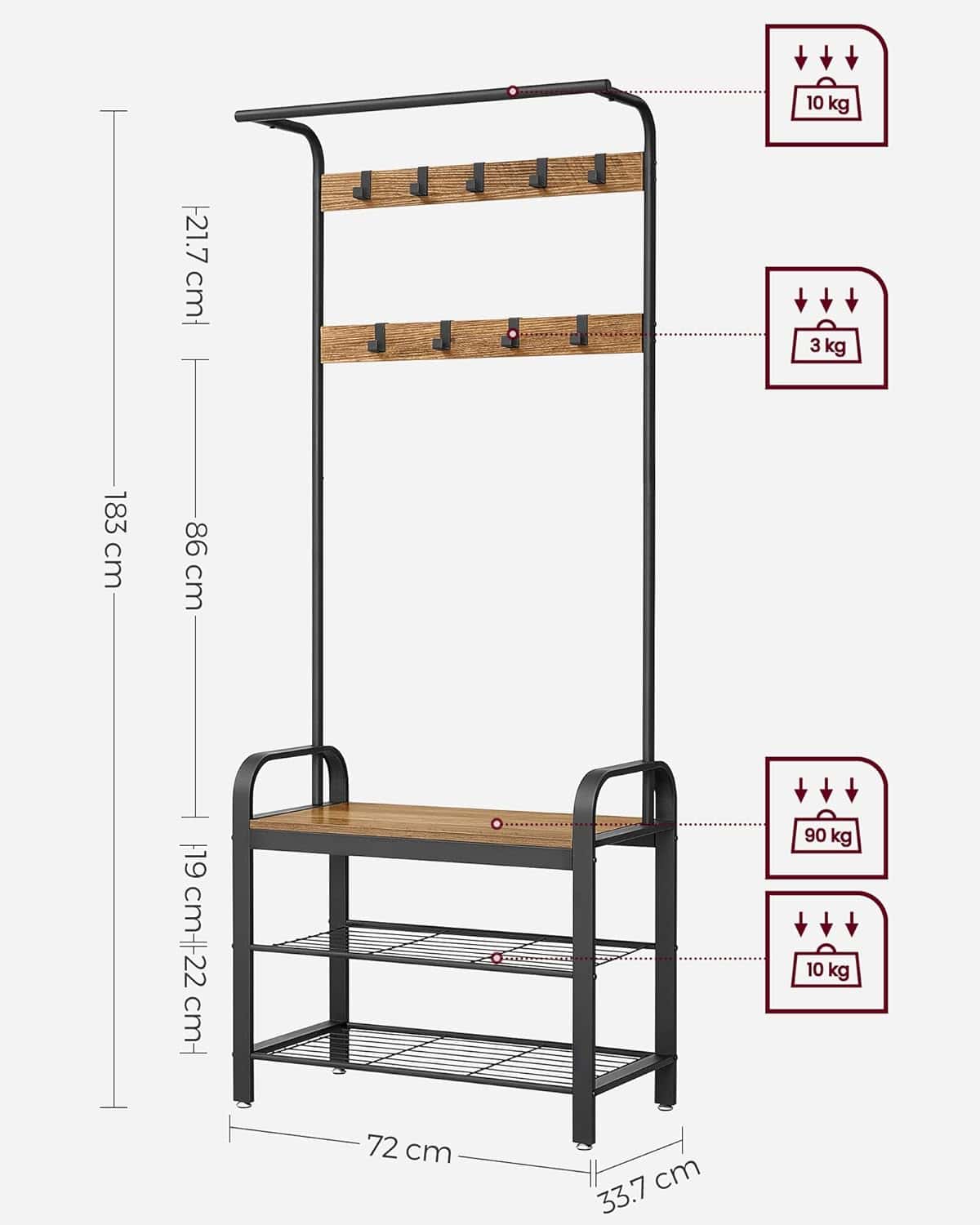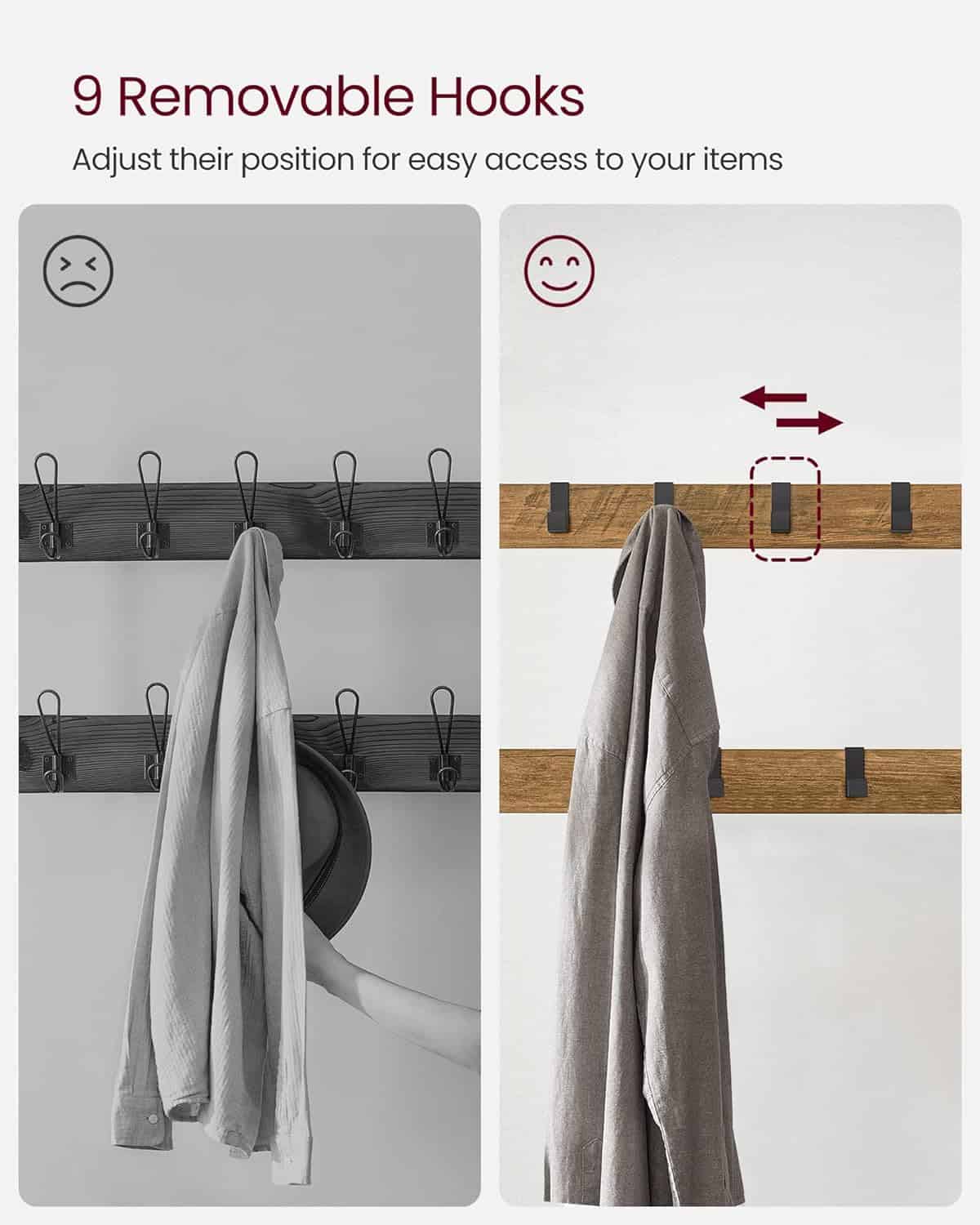 - VASAGLE Cuier pentru haine, cu banc de depozitare a pantofilor, cu 9 carlige detasabile, o sina pentru haine, 34x72x183cm, industrial, nuc rustic si n Mob360 – produs disponibil în magazinul Mob360.