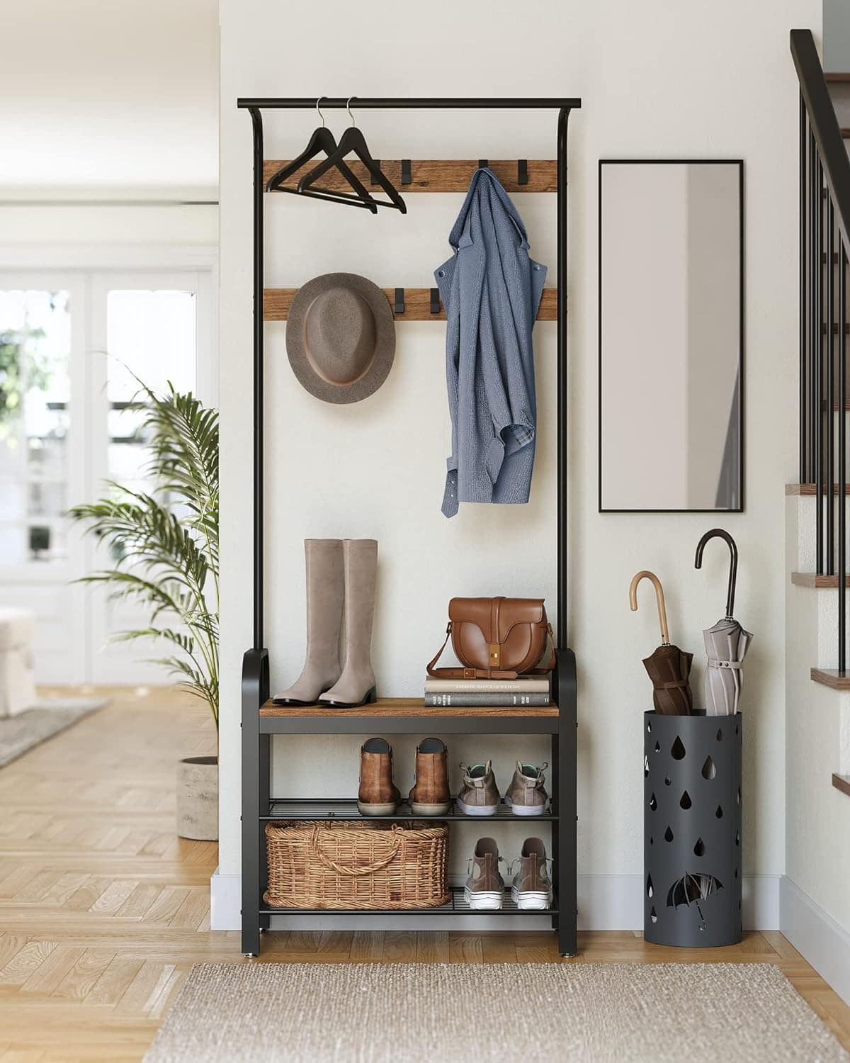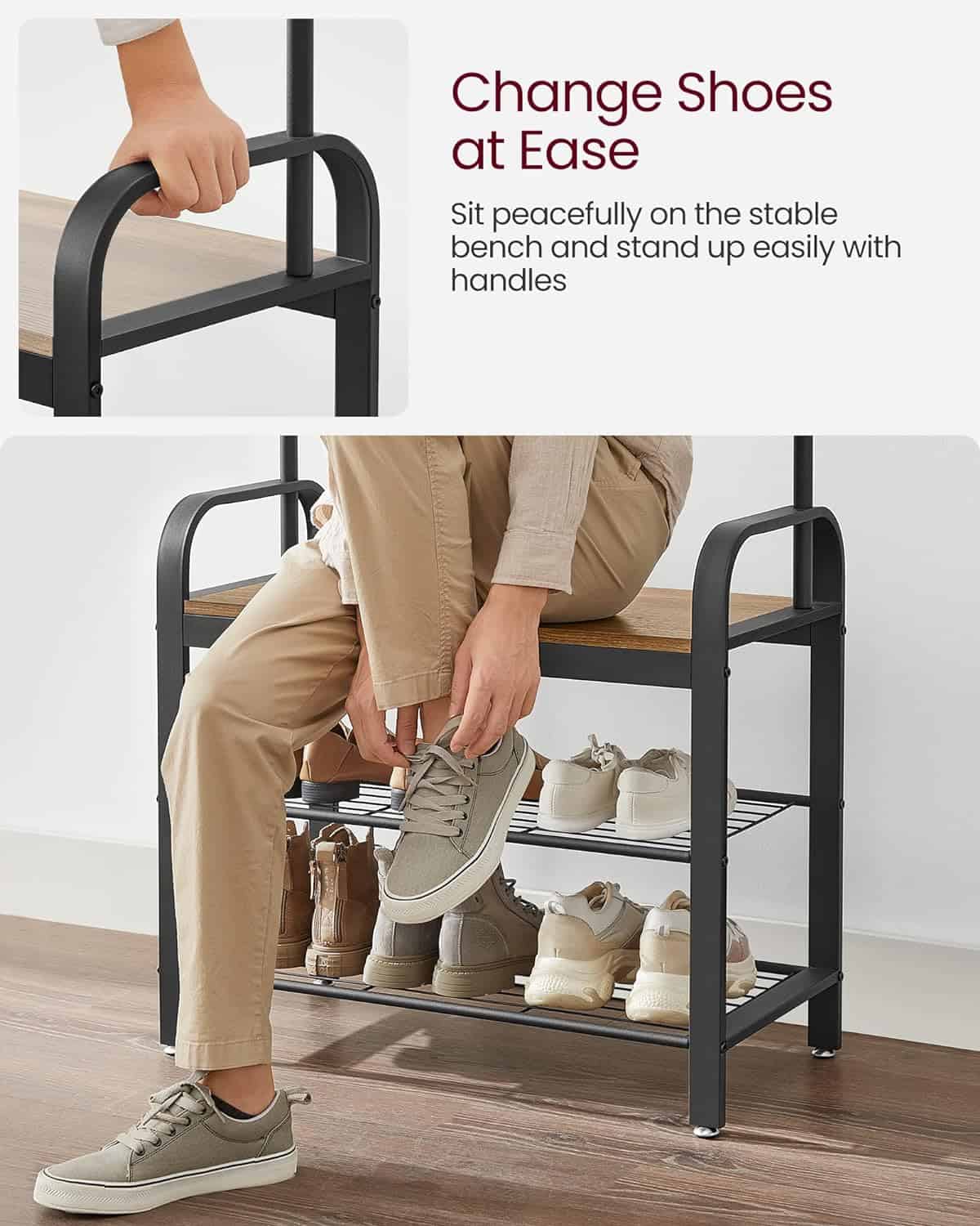 VASAGLE Cuier pentru haine, cu banc de depozitare a pantofilor, cu 9 carlige detasabile, o sina pentru haine, 34x72x183cm, industrial, nuc rustic si n Mob360