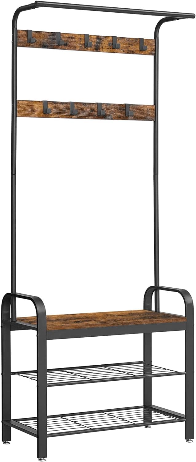 VASAGLE Cuier pentru haine, cu banc depozitare pantofi, 9 carlige detasabile, sina pentru haine, 34x77x183cm, industrial, maro rustic si negru Mob360 este disponibil în magazinul Mob360.