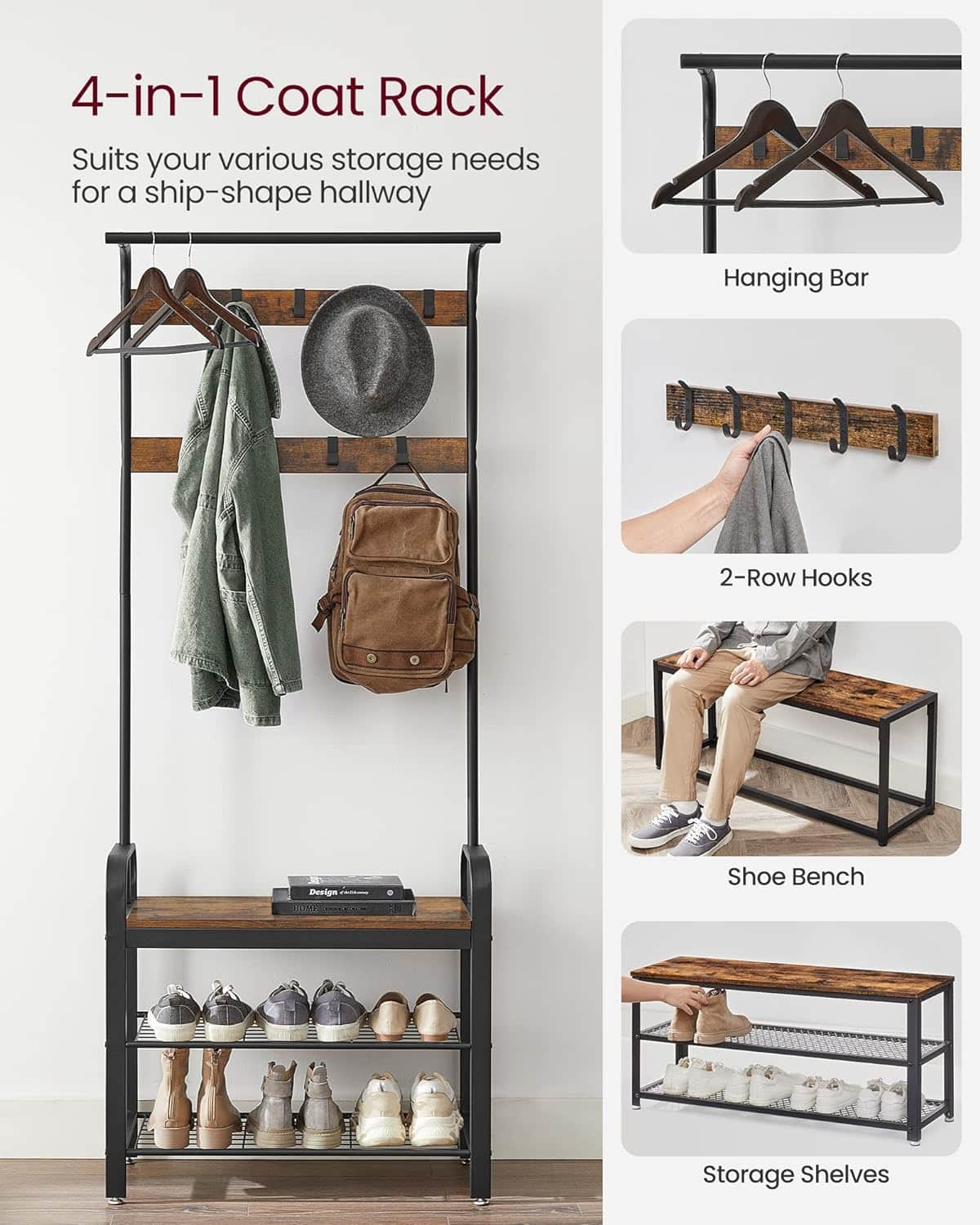 Suport de haine 4 in 1: Aceasta unitate de depozitare pentru hol combina o sina de agatat, o banca pentru pantofi, un suport pentru pantofi si carlige pentru haine – de la agatat haine, organizarea pantofilor si asezarea confortabila pentru a schimba pantofii.