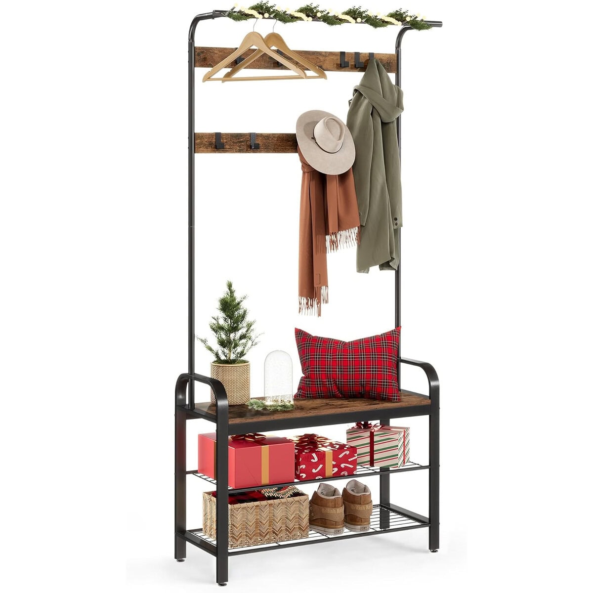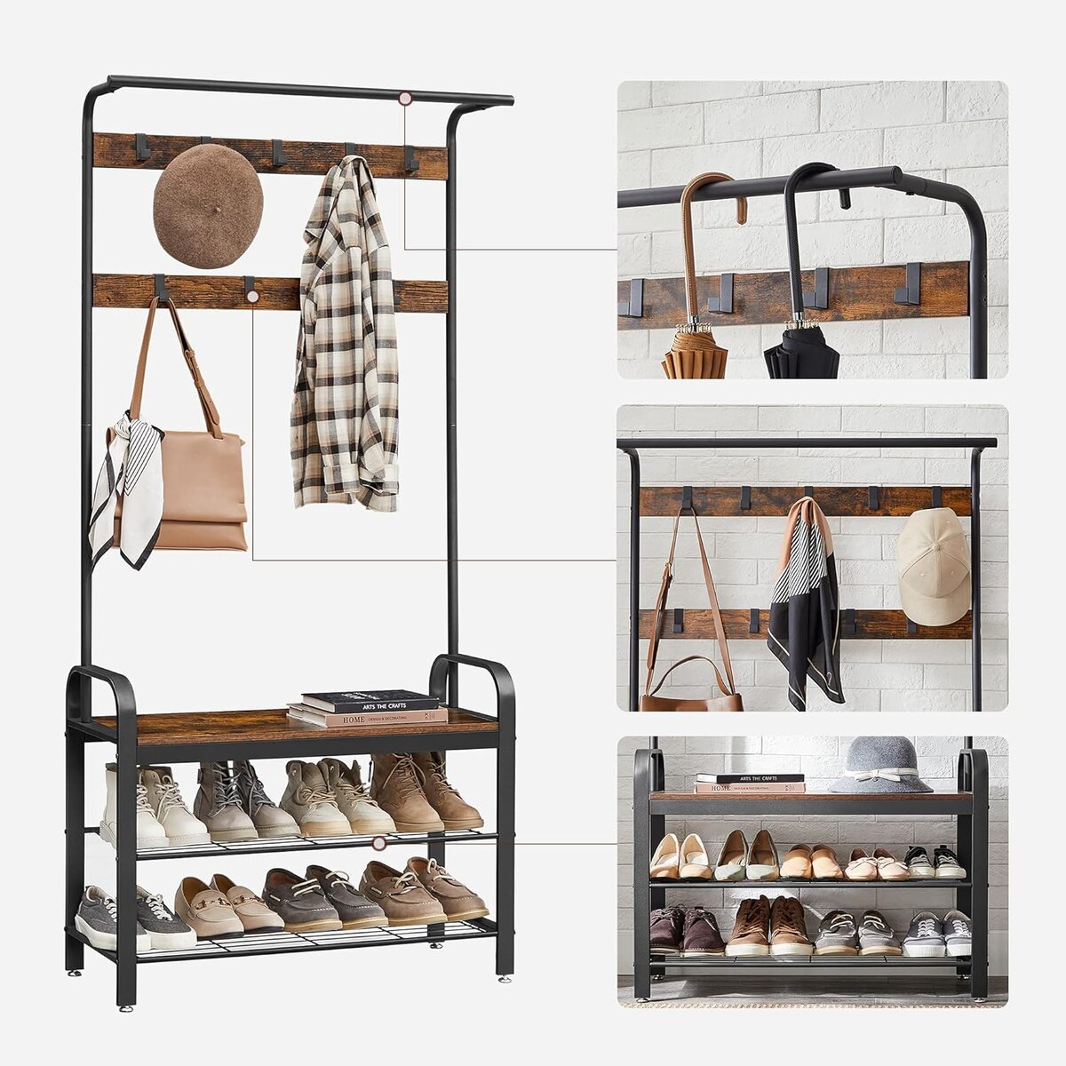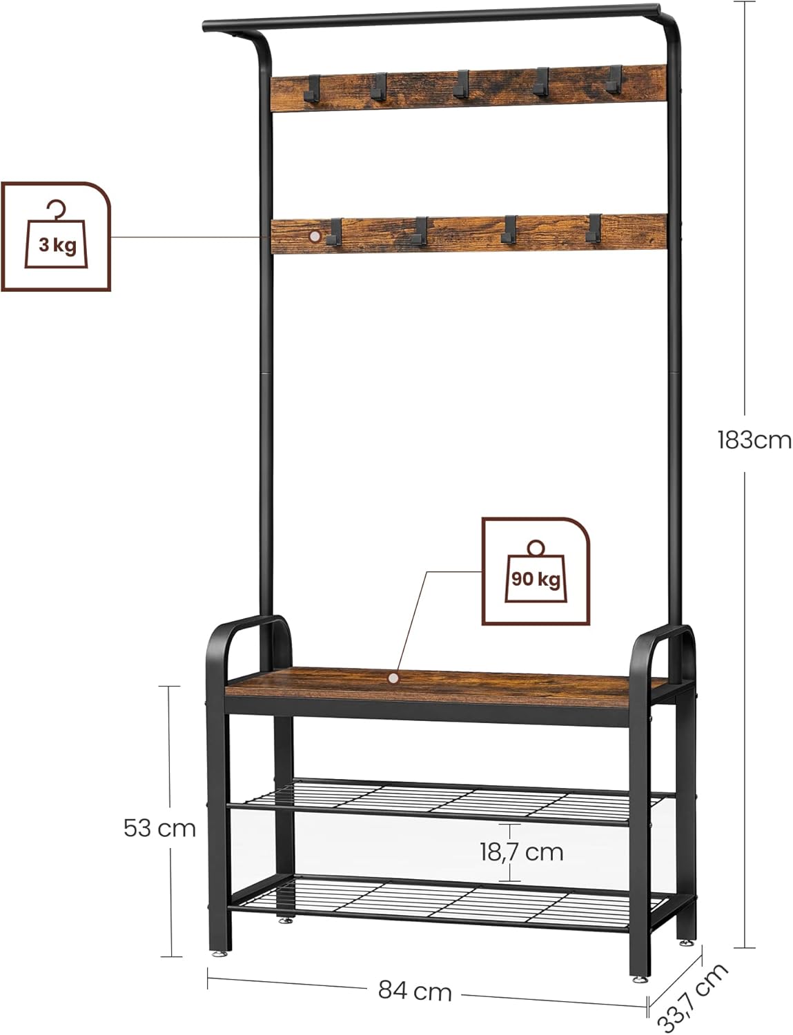 VASAGLE Cuier pentru hol cu banca si suport pantofi, stil industrial, 84x34x183 cm, maro rustic Mob360