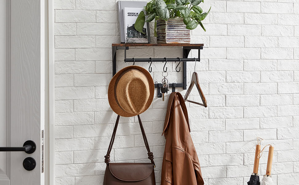 VASAGLE Cuier perete cu 8 carlige si polita, 40x24x24 cm, maro rustic si negru Mob360