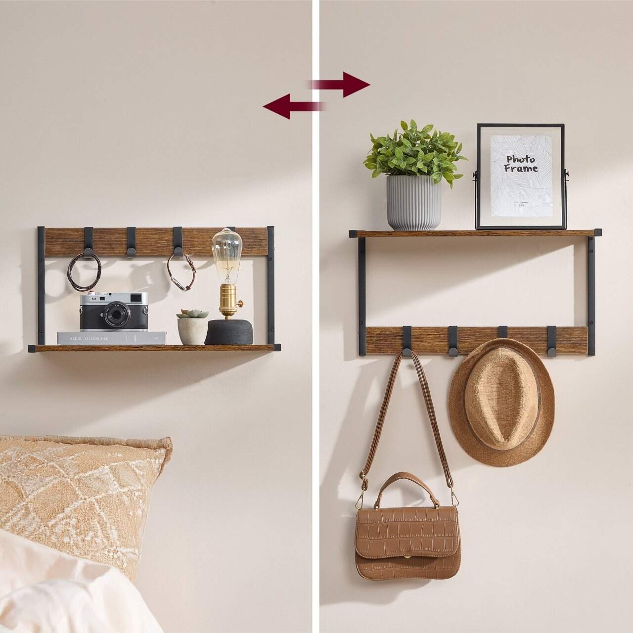 VASAGLE Cuier perete set 2 bucati, PAL si cadru metalic, 50x24x27 cm, maro rustic Mob360 – produs disponibil în magazinul Mob360.