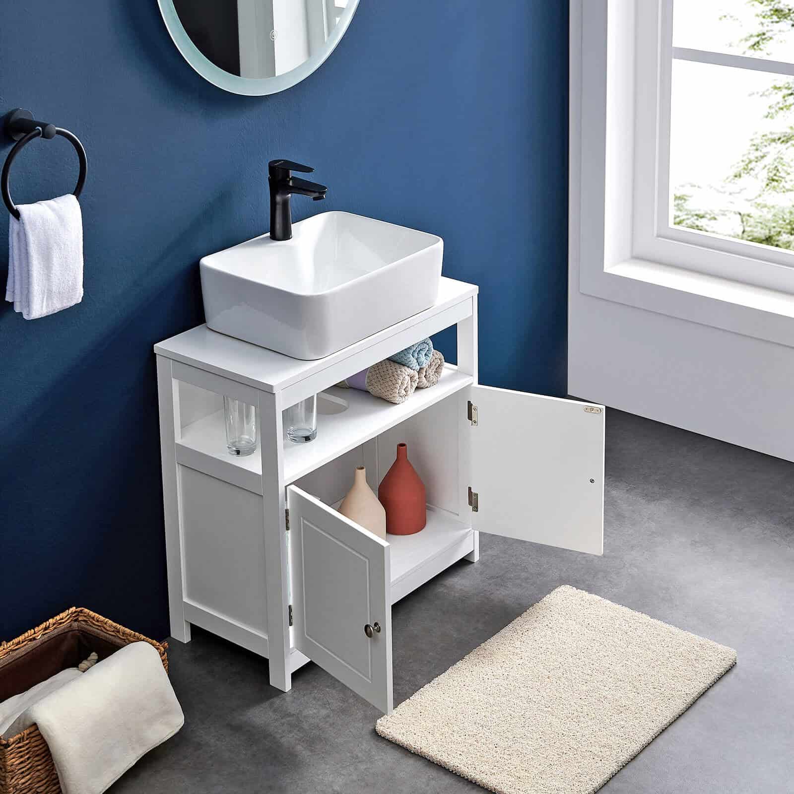 - Dulapul de baie VASAGLE aduce un plus de ordine si stil in spatiile mici. Designul scandinav cu finisaj alb mat si compartiment deschis asigura atat functionalitate, cat si un aspect curat. Cu o constructie stabila si un decupaj dedicat pentru sifon, acest model este perfect pentru integrarea sub lavoar. Caracteristici principale:
