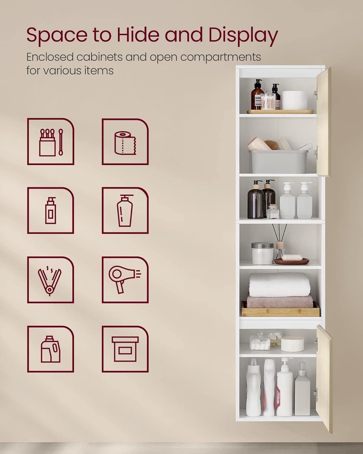 VASAGLE Dulap baie cu montare pe podea sau perete, 7 compartimente, 30x40x160 cm, alb bej Mob360 este disponibil în magazinul Mob360.