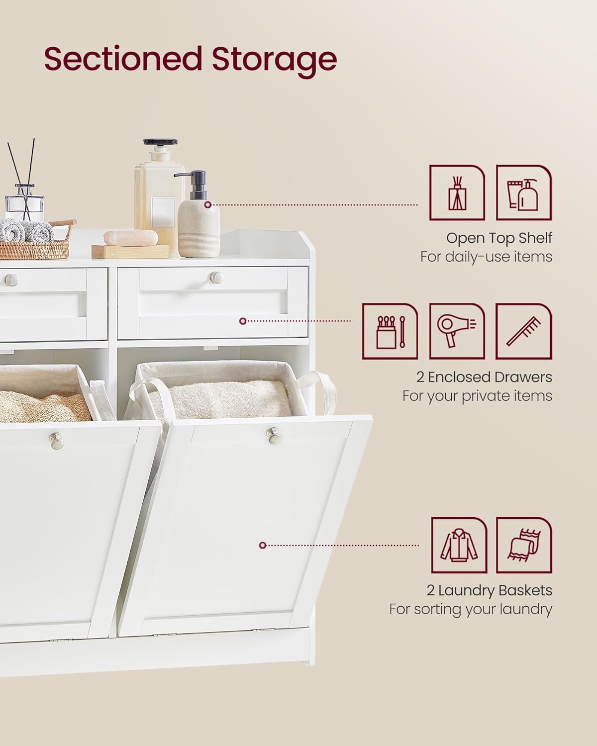 VASAGLE Dulap baie de podea, 2 cosuri de rufe integrate cu saci detasabili, 2 sertare, 79x40x80 cm, alb Mob360 – produs disponibil în magazinul Mob360.