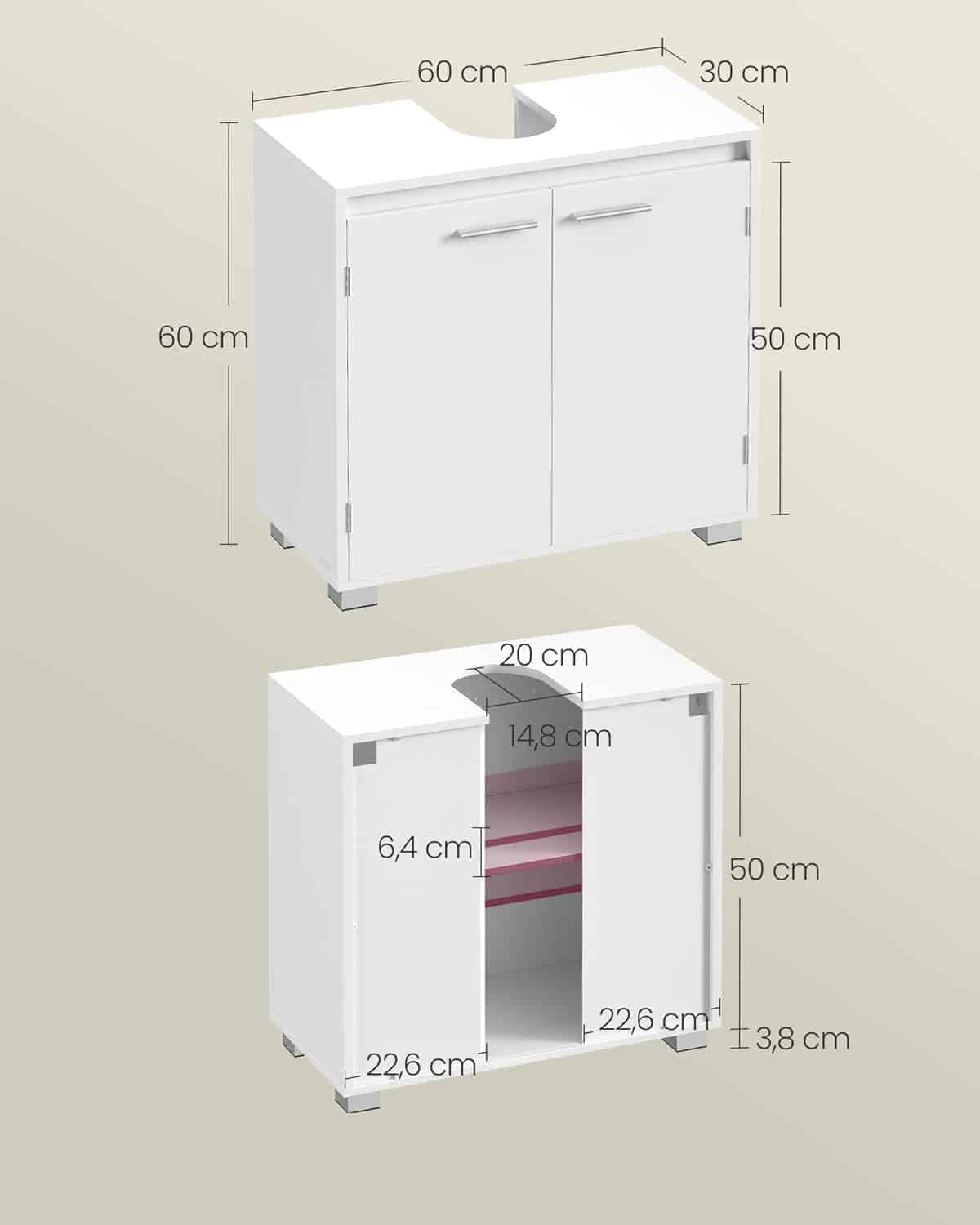 VASAGLE Dulap baie pentru suport lavoar, MDF, 2 compartimente, raft interior reglabil, 30x60x60 cm, alb Mob360