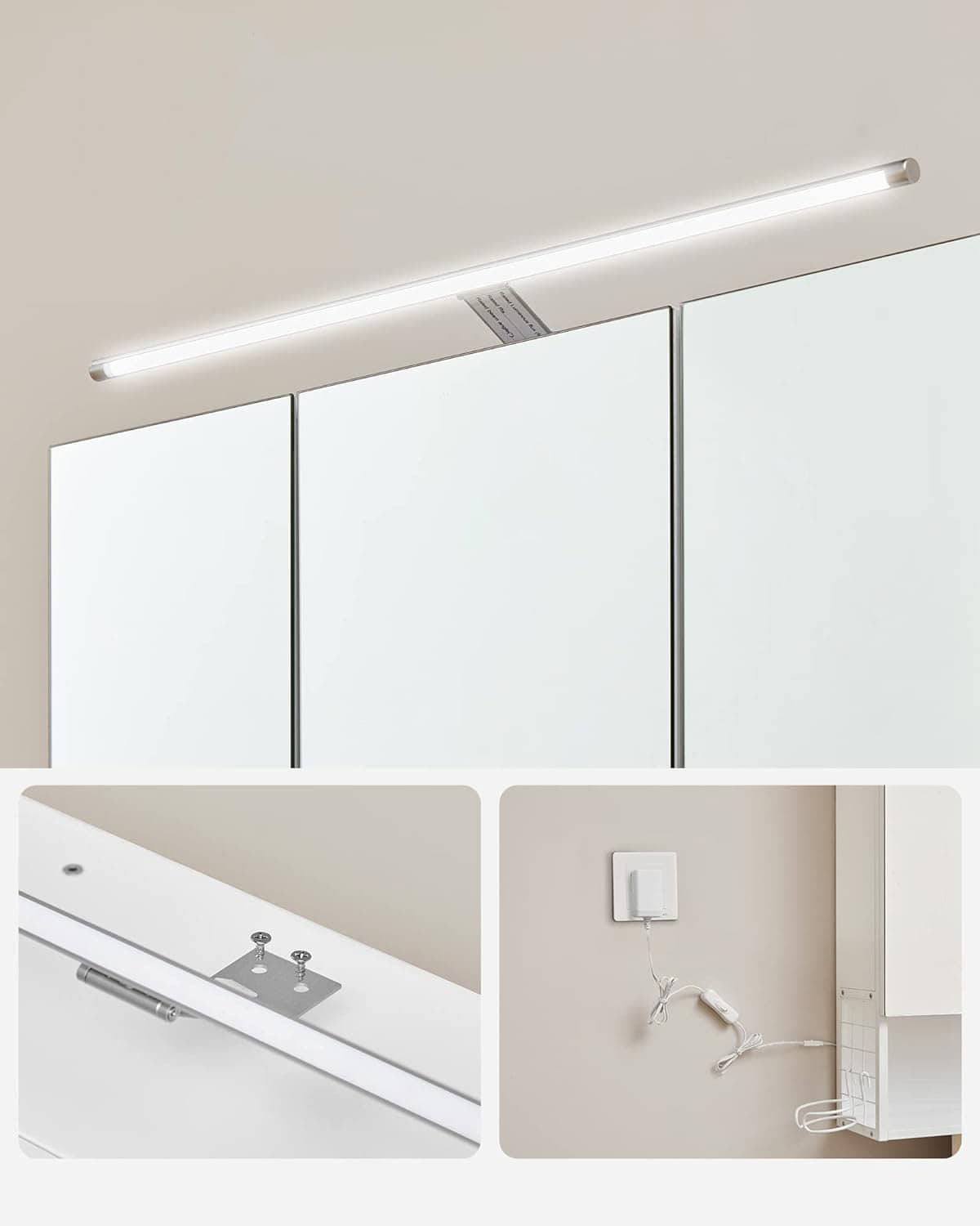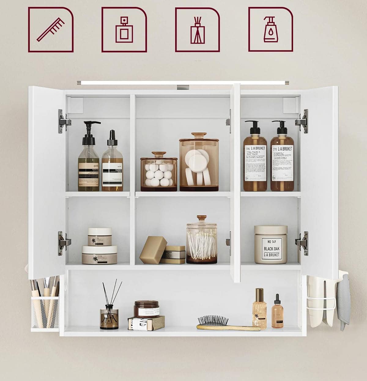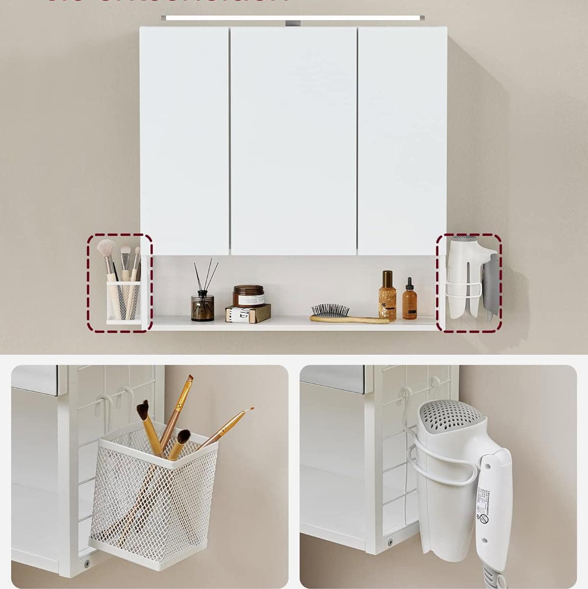 mici, iar pe cealalta parte exista un suport pentru uscator de par, care faciliteaza utilizarea uscatorului de par.Partea superioara a dulapului cu oglinda este echipata cu o bara de lumina, astfel incat sa va puteti finaliza cu usurinta rutina zilnica de ingrijire a pielii si machiaj.Ascundeti-va secretele in spatele usilor oglinzii, care nu numai ca va protejeaza intimitatea personala, dar adauga si o frumusete simpla baii dvs.Compartimentul deschis din partea de jos este convenabil pentru a va stoca articolele necesare zilnic, astfel incat sa le puteti accesa in orice moment.